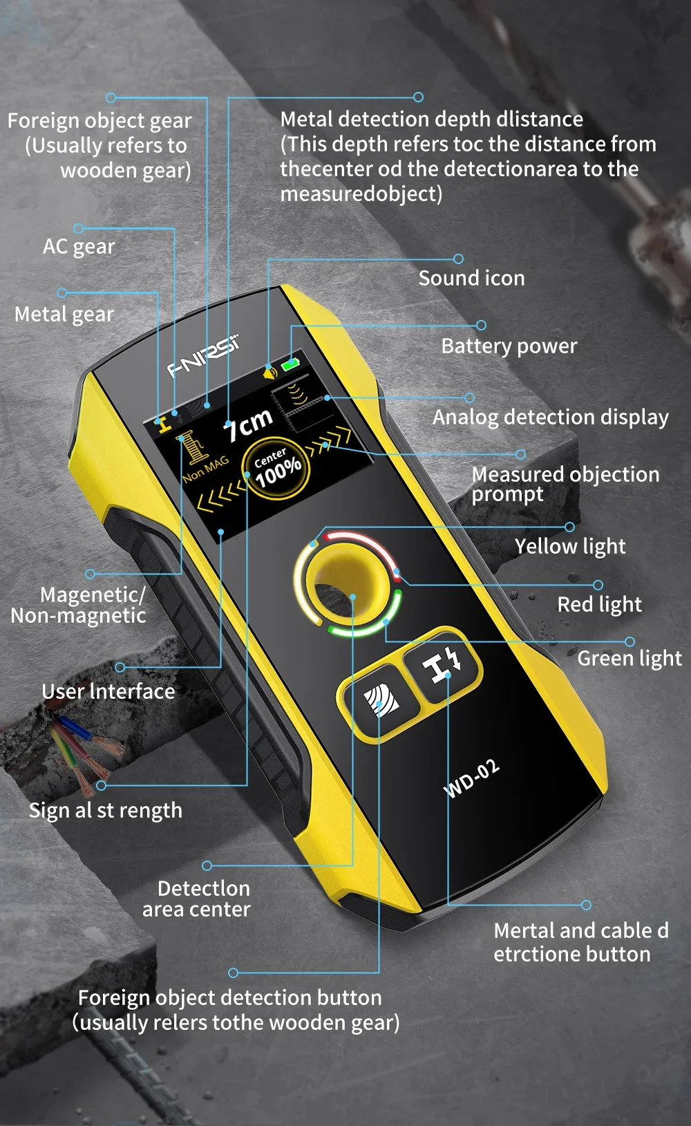 FNIRSI WD-02 Wall Detector is an upgraded version of WD-01, WD-02 has upgraded high-definition TFT display screen and new UI interface. Also added 6 languages: Russian, English, Portuguese, Japanese, Simplified Chinese, and Traditional Chinese. Its 3-level sensitivity adjustment makes the measurement accuracy higher. It can be used to detect steel bars, metal joists, metal pipes, wood, wires in walls, ceilings and floors. 3 detection modes are designed, metal detection mode, wood detection mode and AC detection mode to meet your different working needs. The brand-new positioning hole design is no longer afraid of drilling wires and steel bars. Widely used in interior decoration, home installation and other industries, so that various constructions can be carried out safely.