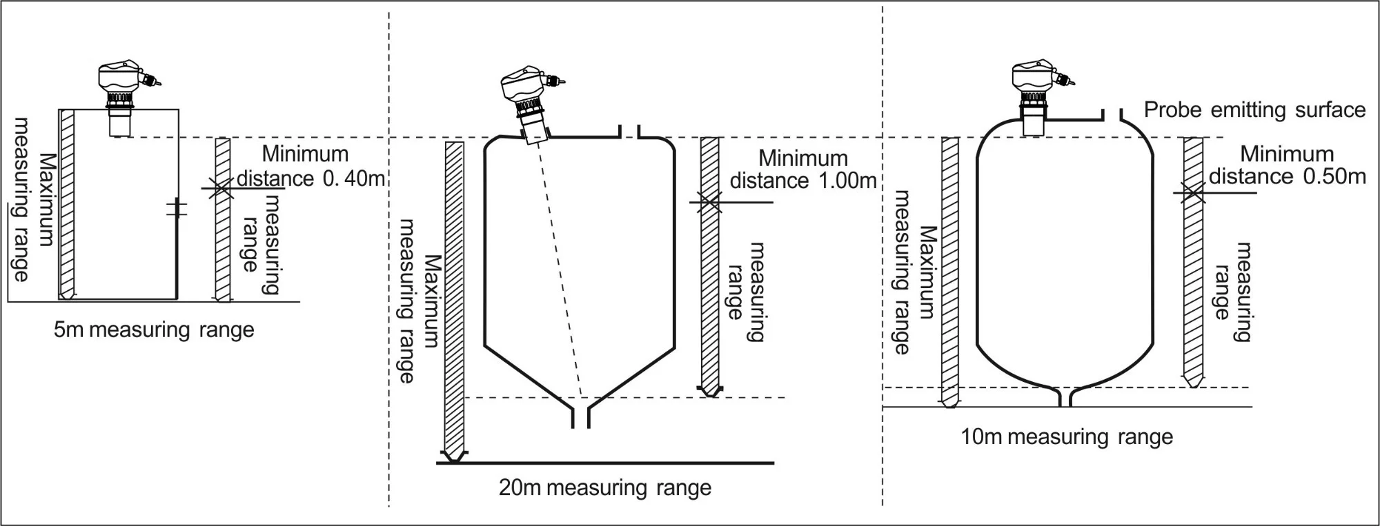 1. The distance from the transmitter surface of the probe to the lowest liquid level should be less than the range of the optional instrument.
