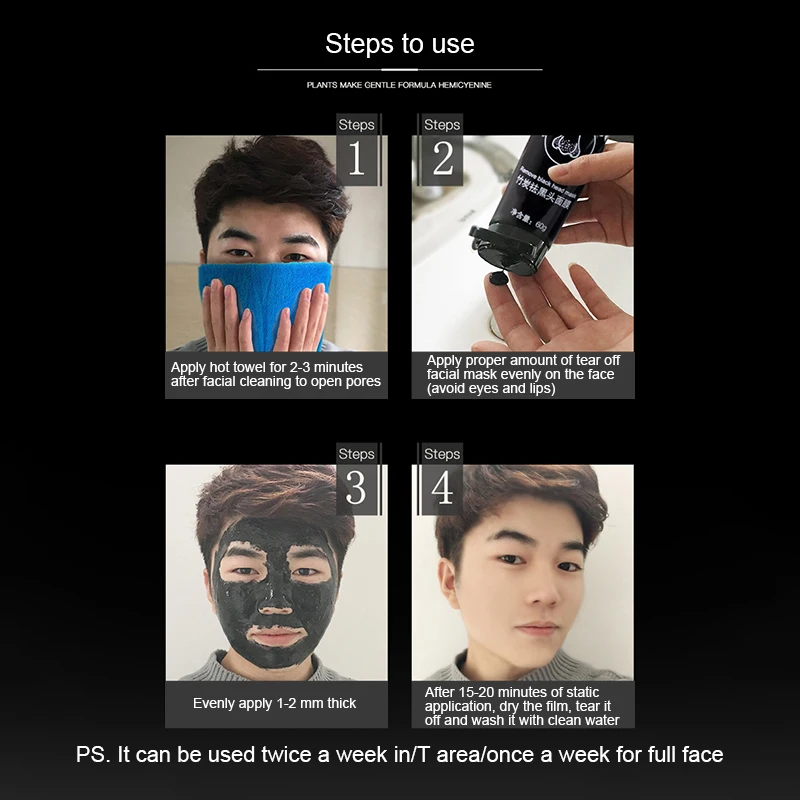 Step 3 : Peel off the black mask gently from chin to forehead .
