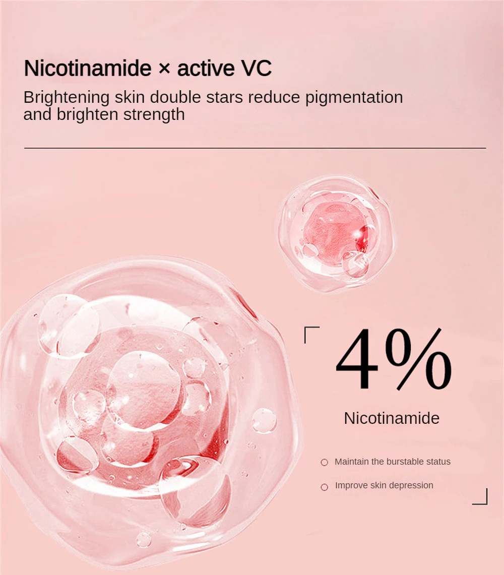 3. 【brighten skin color】: niacinamide, maintain elastic moist state, improve skin dullness; VC derivative, soft and smooth skin, make skin feel soft and smooth