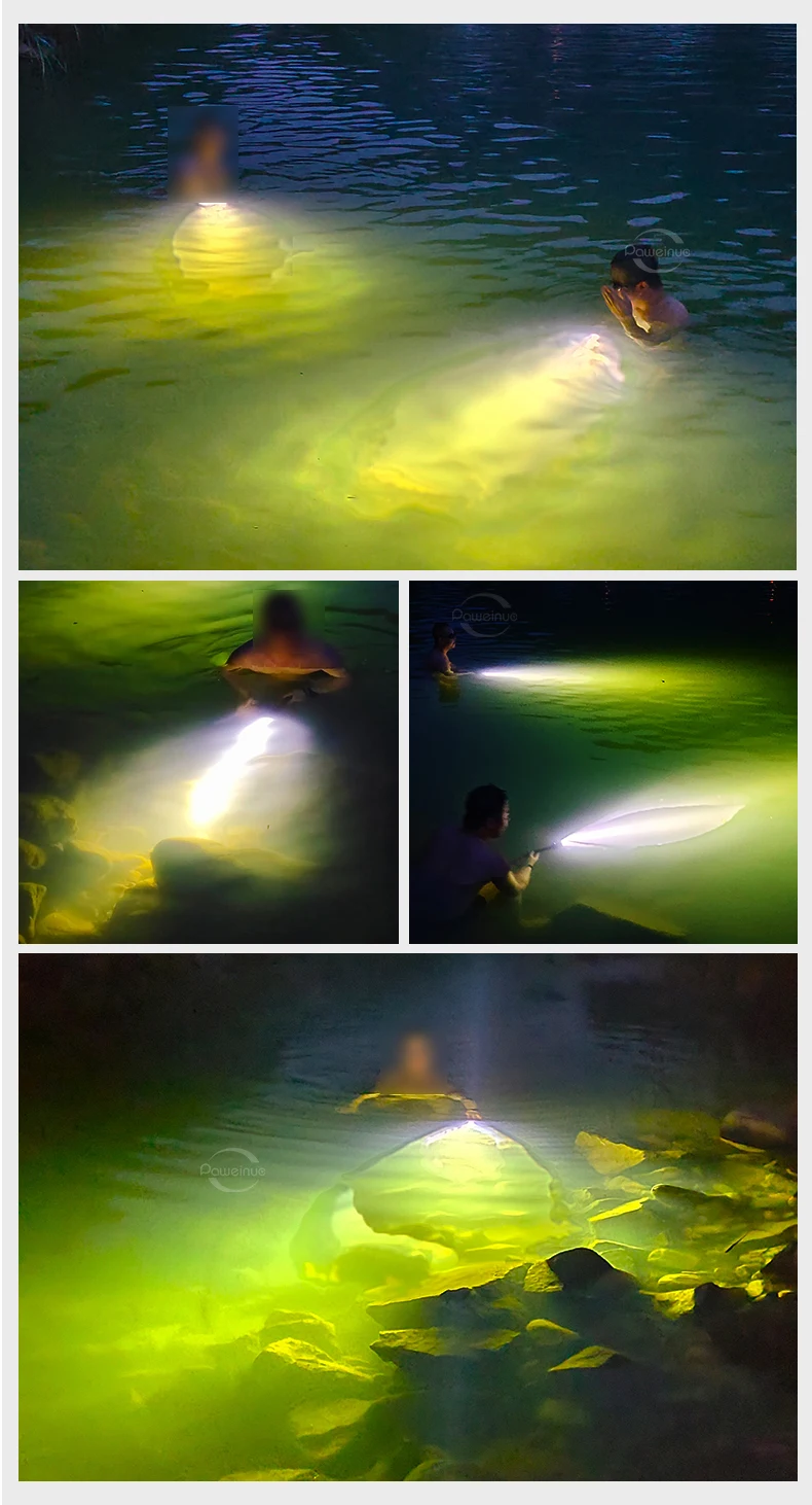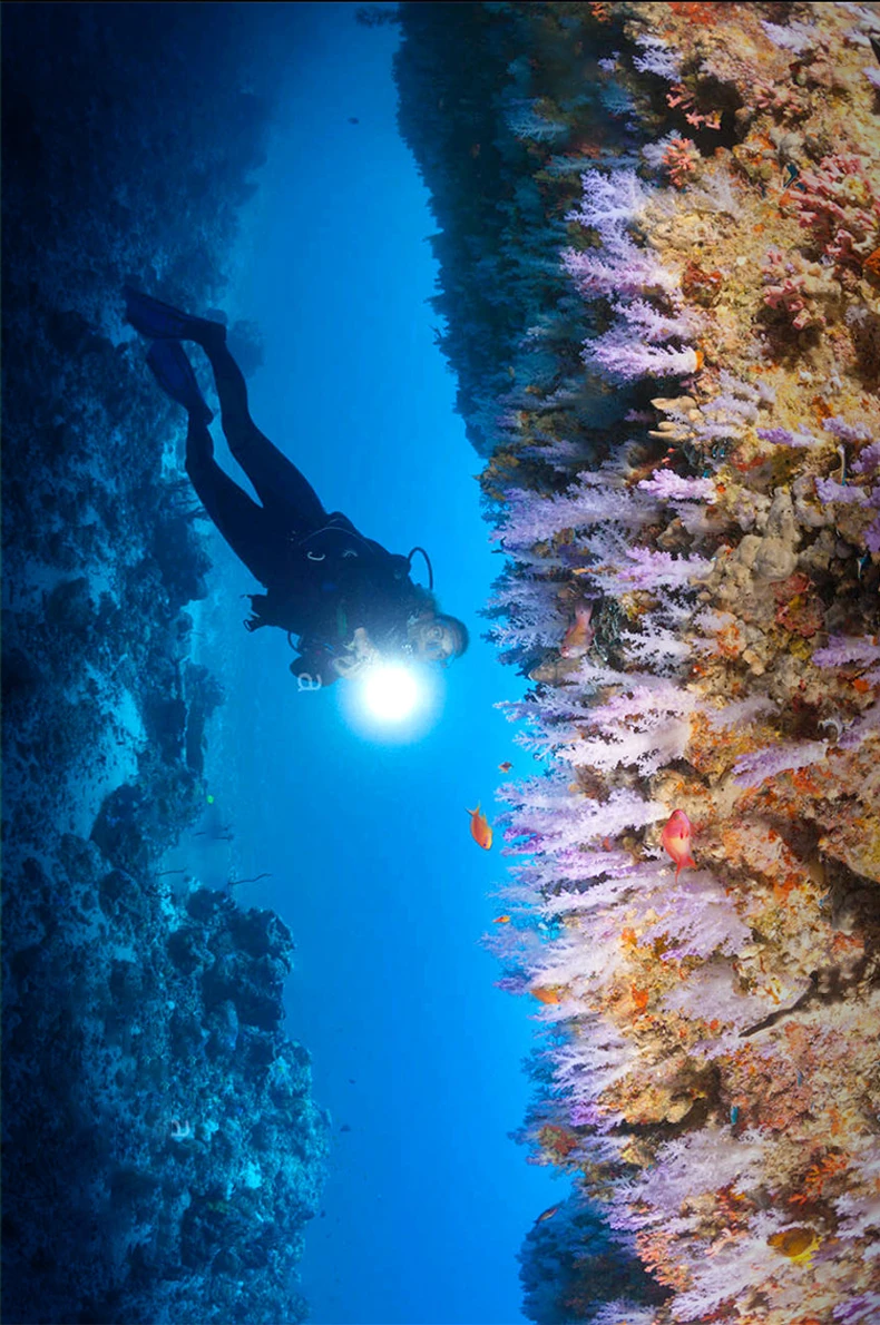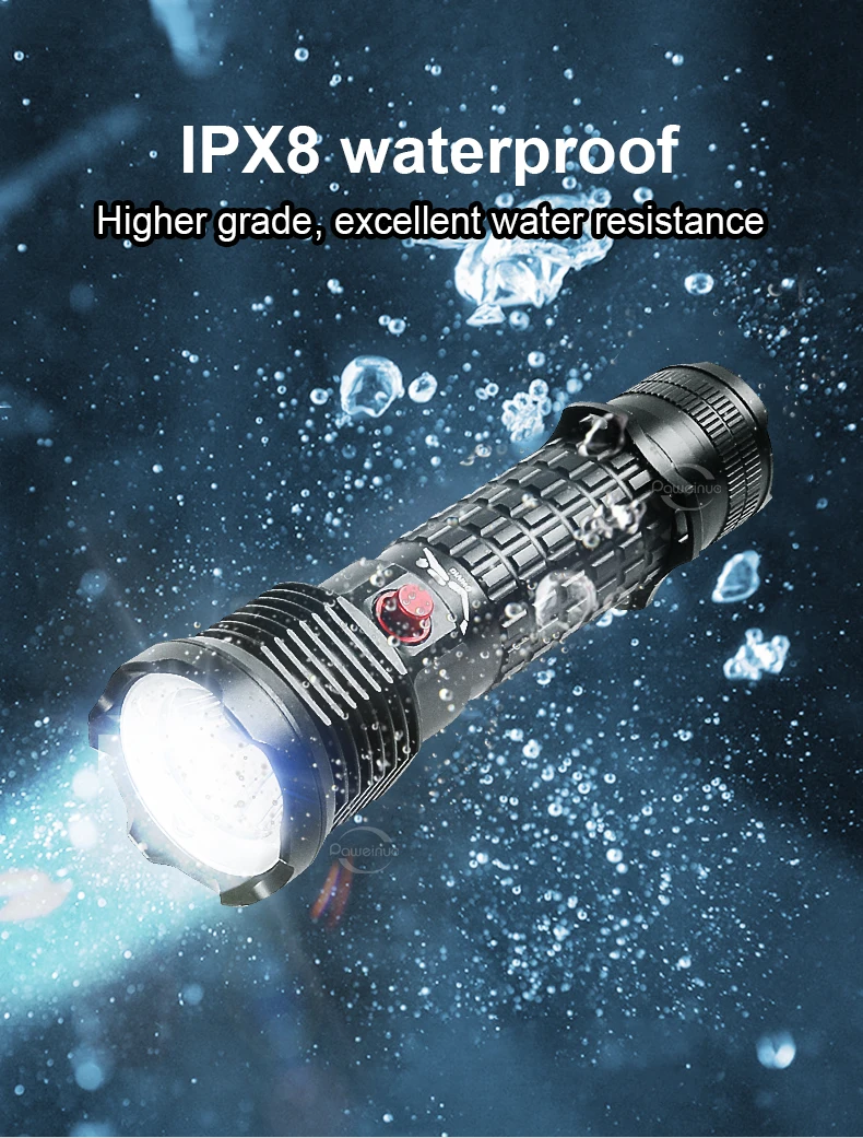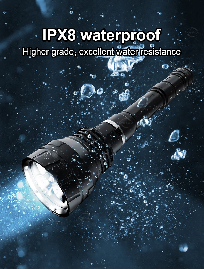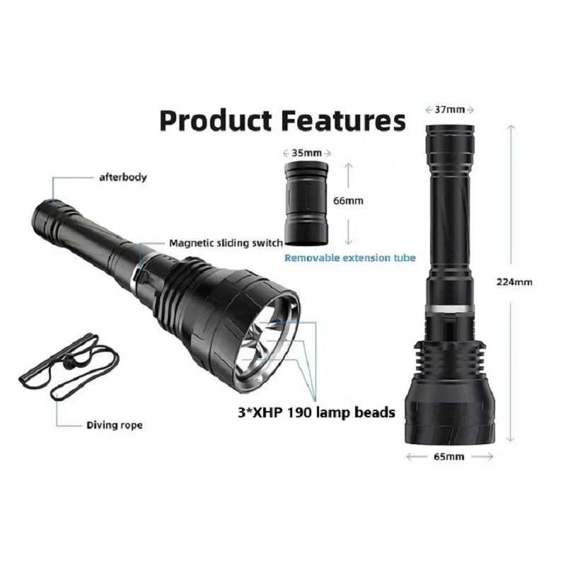 The latest new diving flashlight launched in 2023. This flashlight uses 3*XHP190 ultra-bright wick and 8000 lumens to clearly see underwater targets when you dive. 2 modes, you can switch different lights. This flashlight is detachable and can use 2 batteries or 3 batteries. The 3-battery lighting can dive to a depth of 800 meters, while the 2-battery lighting can only go to a depth of 600 meters. The multi-slot heat dissipation function ensures that it will not get hot even after being used for a long time, ensuring that the lamp wick and battery can be used for a longer period of time. One-touch magnetic switch makes switching more convenient, and the thickened waterproof ring is not afraid of corrosion and water intrusion, so you can enjoy your diving time.