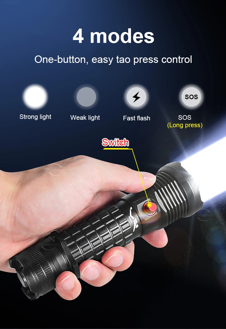 4 modes: strong light – weak light – quick flash – long press for 3 seconds to switch to SOS