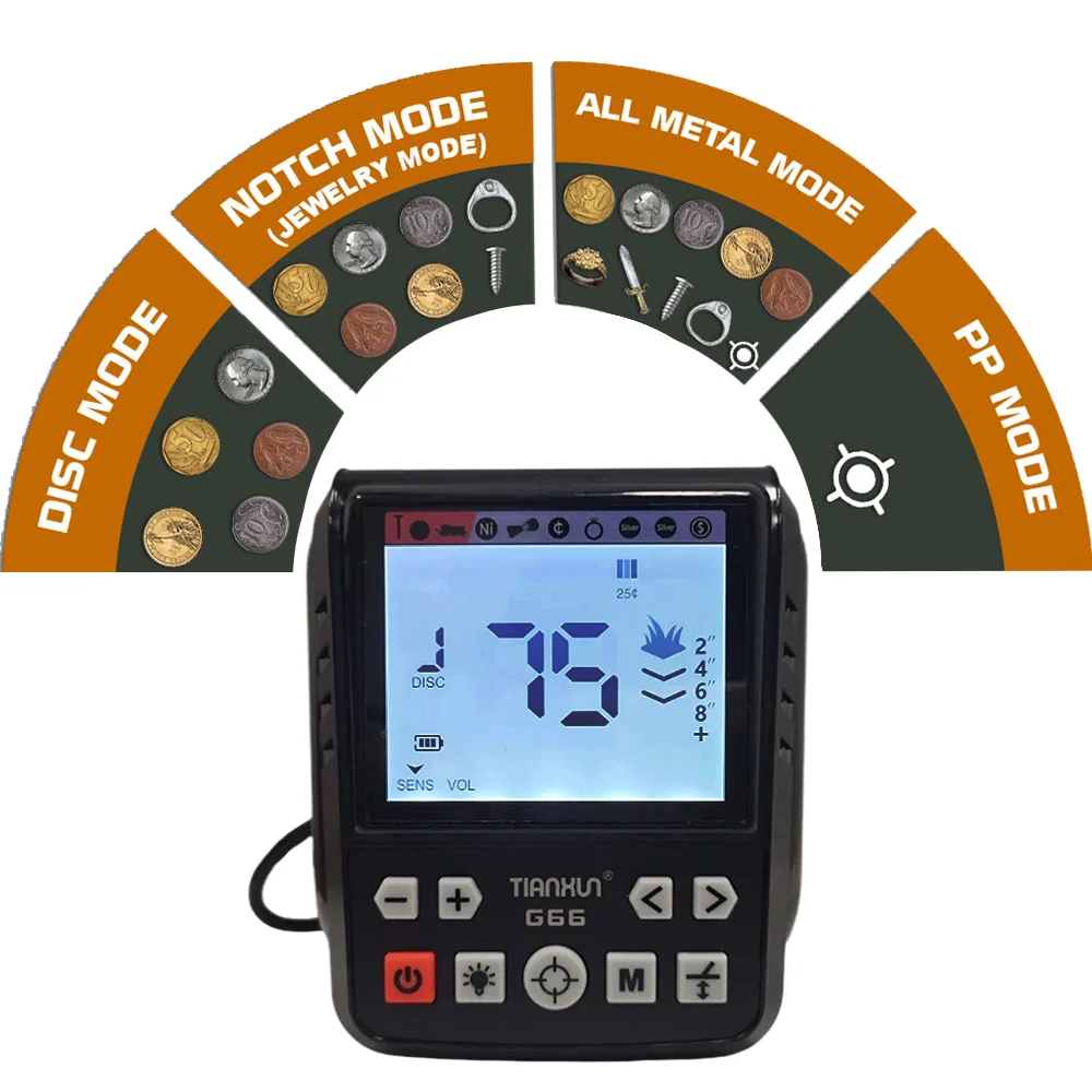 Users can choose to shield any one or more precise metals according to their needs or preferences when using the detector It can only be used in jewelry mode and coin mode Press the mode key, the square above will flash, and then press ↑ or ↓ to move and then press the mode key to block or cancel
