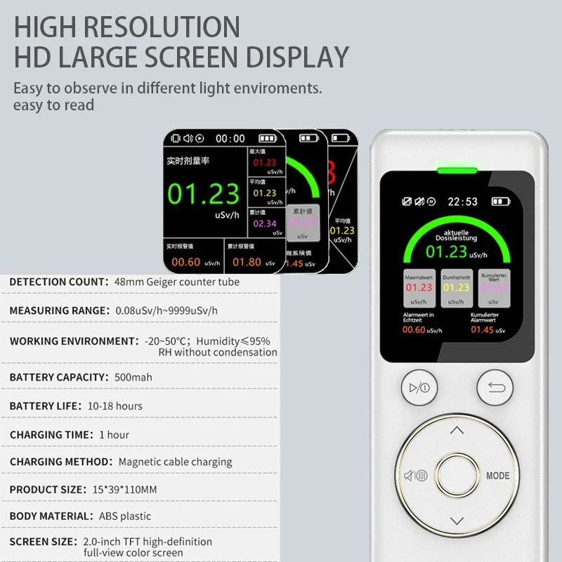 [Long Battery Life] With a powerful rechargeable lithium battery, this portable radiation detector only requires 2 to 3 hours of charging and can continuously measure for 24 hours, providing convenience and reliability.