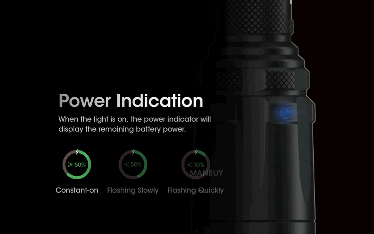 • » Tail cap is U-shaped to prevent accidental activation and allows light to stand on its own