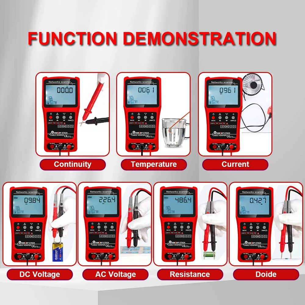 ET624: Multimeter Function, ACV, DCV, DCA, Alternating Current current, Resistance, Continuity Buzzer, Diode, Temperature, Coaxial Cable Length Measurement, Network Cable Short Circuit and Circuit Break Test