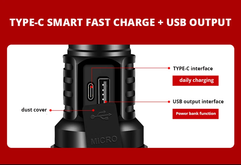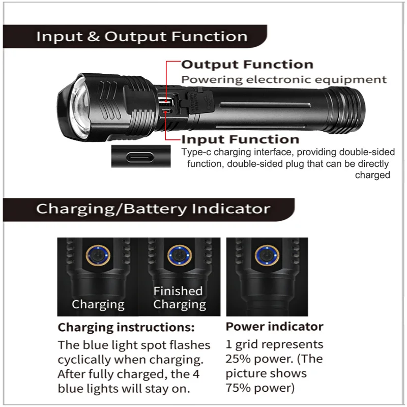 New Type-c USB fast charging, battery display function, added output function, can be used as a power bank to charge mobile phones, increased lens, wider lighting range, anti slip texture on the body, anti slip and anti scald