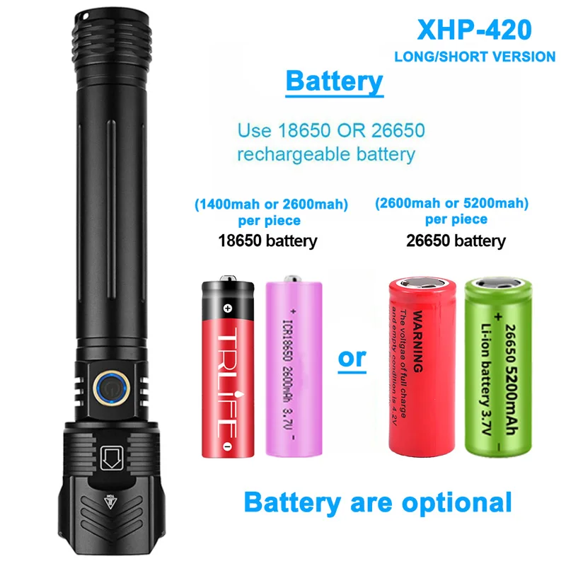 XHP420 Lamp supprt 18650 or 26650 battery, we have 1400mah/2600mah 18650 battery and 2600mah/5200mah 26650 battery for choose.