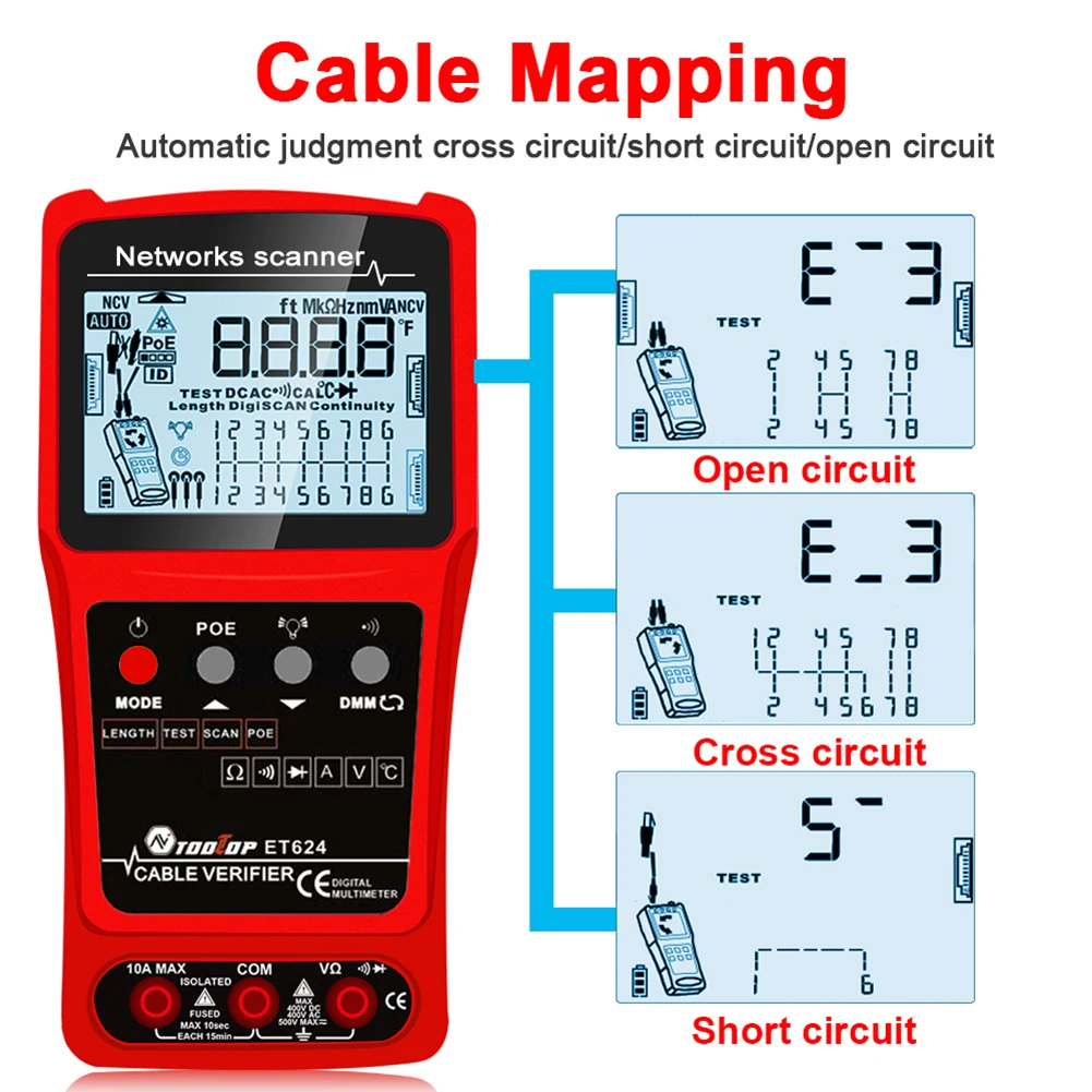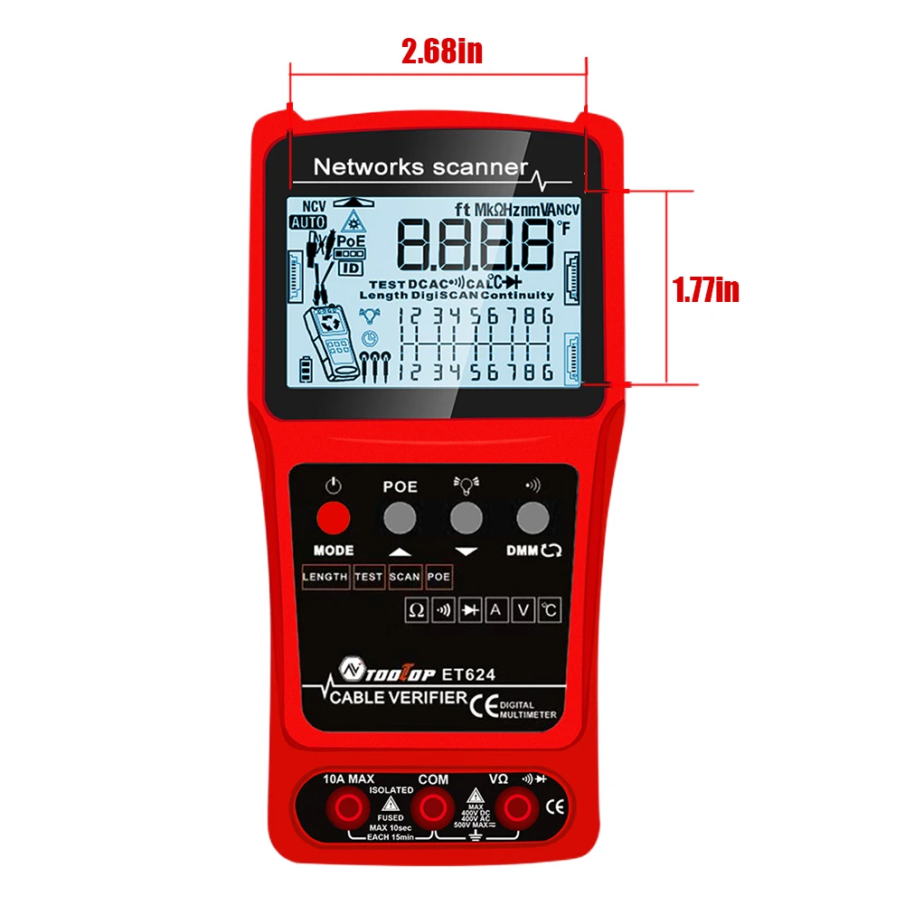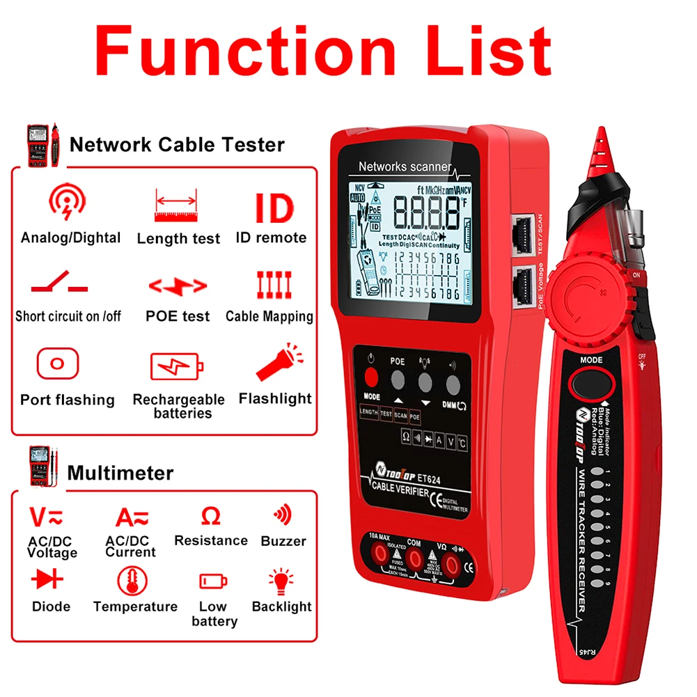 ET624: Multimeter Function, ACV, DCV, DCA, AC Current, Resistance, Continuity Beeper, Diode, Temperature, Coaxial Cable Length Measurement, Network Cable Short and Open Circuit Test