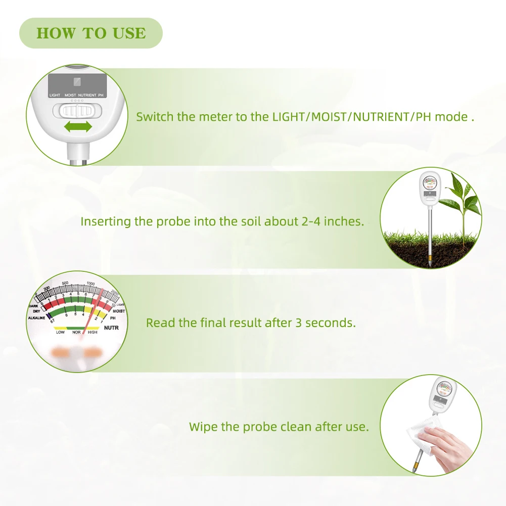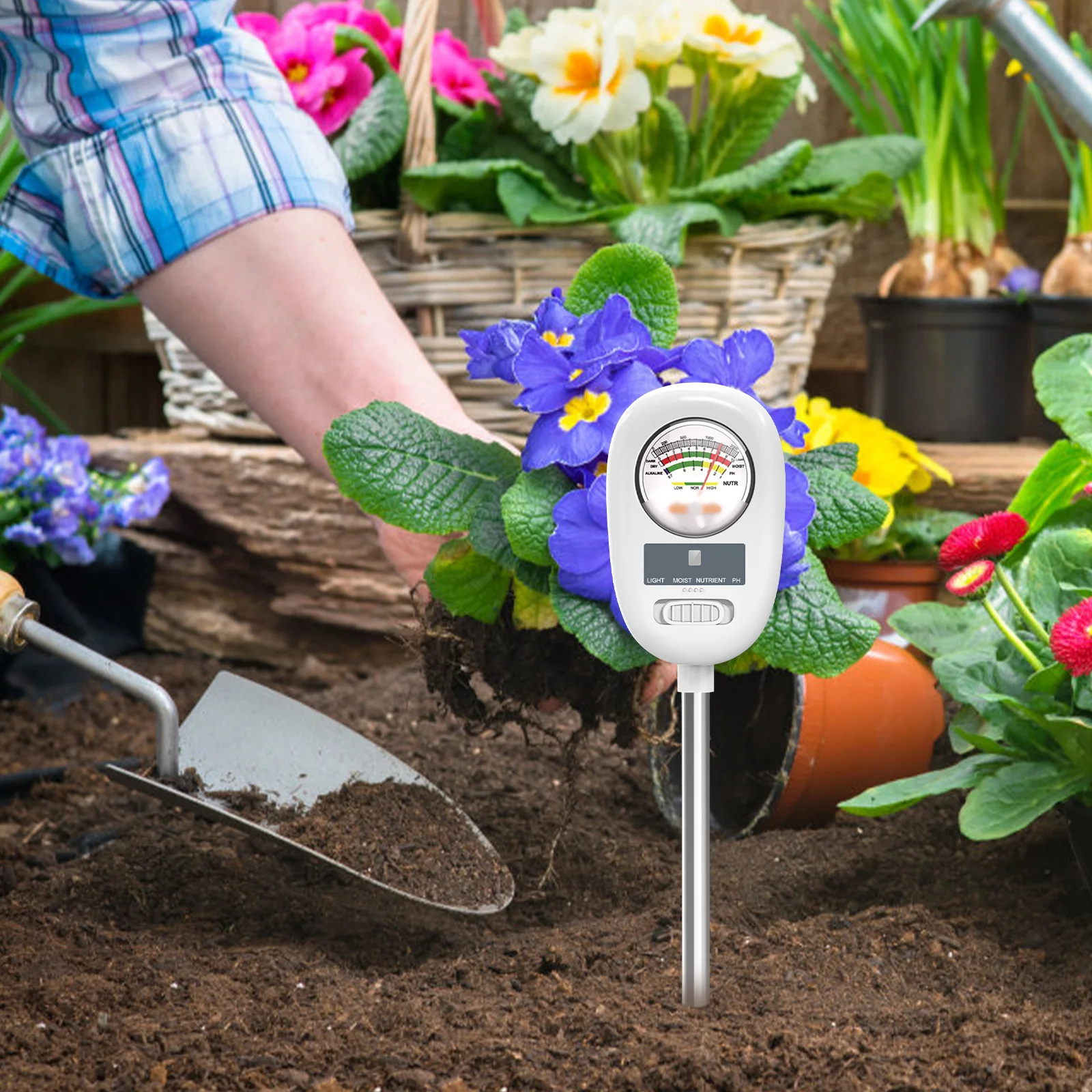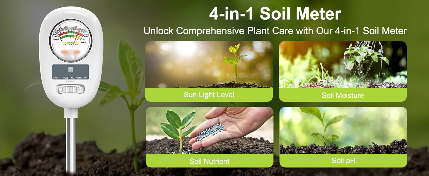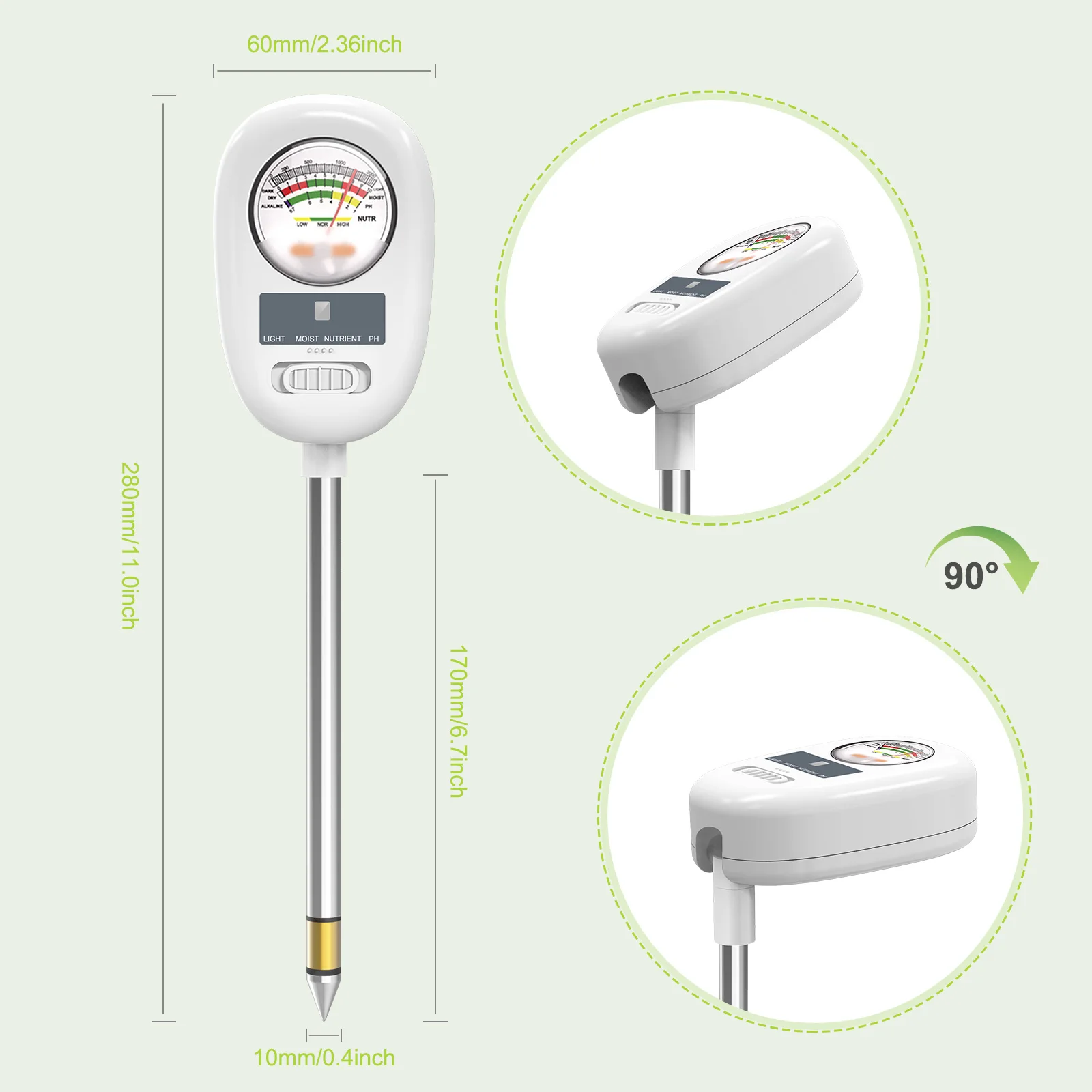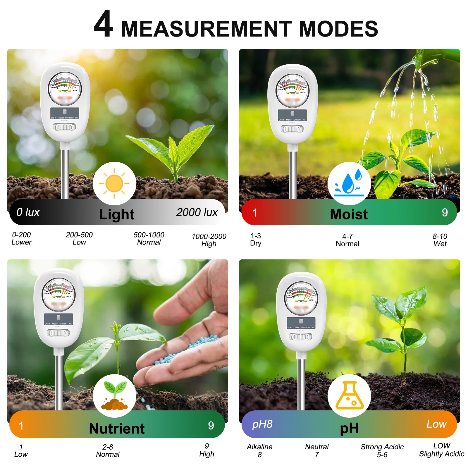 4-in-1 Soil Test Kit: Our 4-in-1 Soil Tester offers a complete solution to measure soil moisture, pH, nutrient levels, and light conditions simultaneously. Unlike single-function testers, you only need one tool to gain a full understanding of your plants. It empowers you to provide precise water, fertilizer, and light, fast-tracking your path to a thriving.