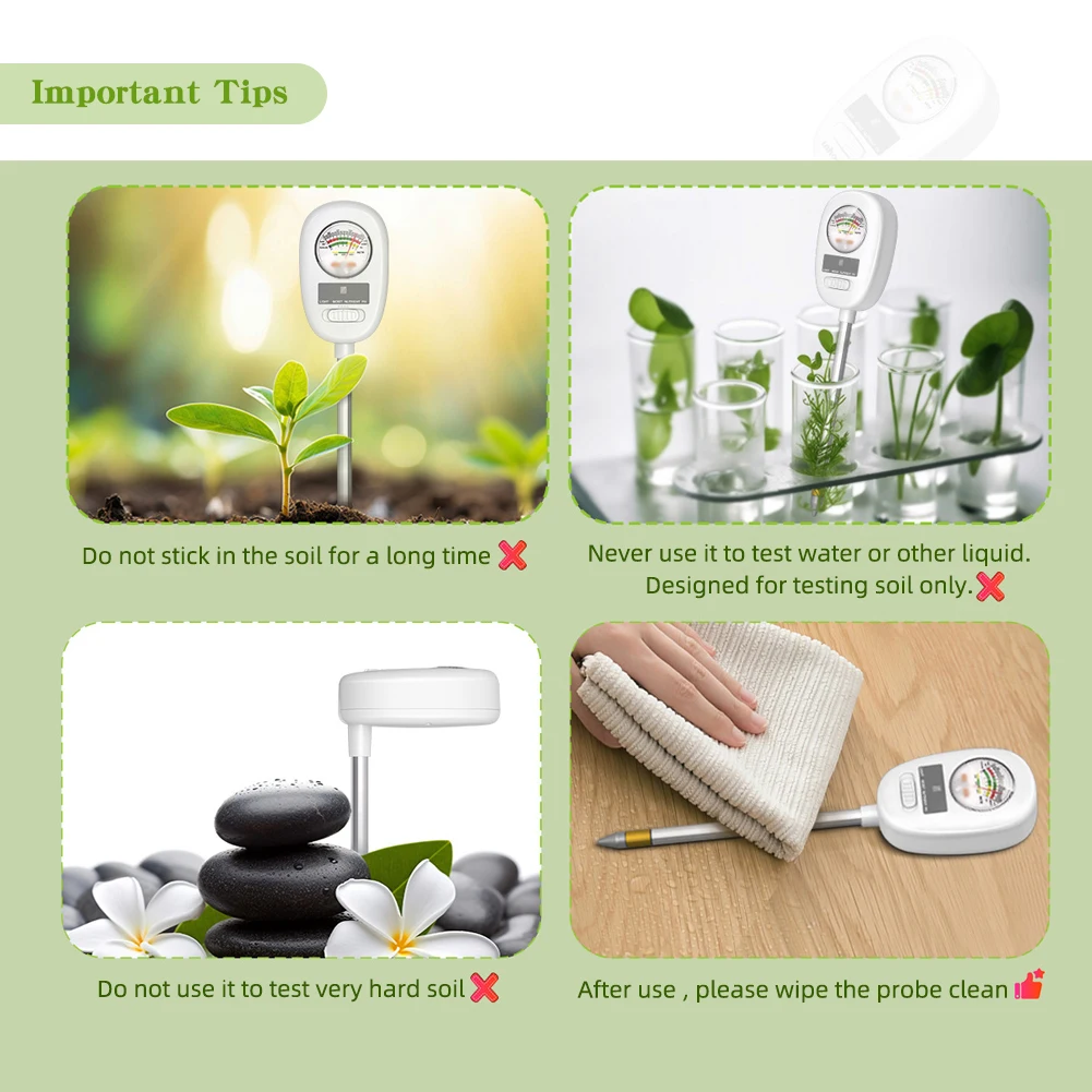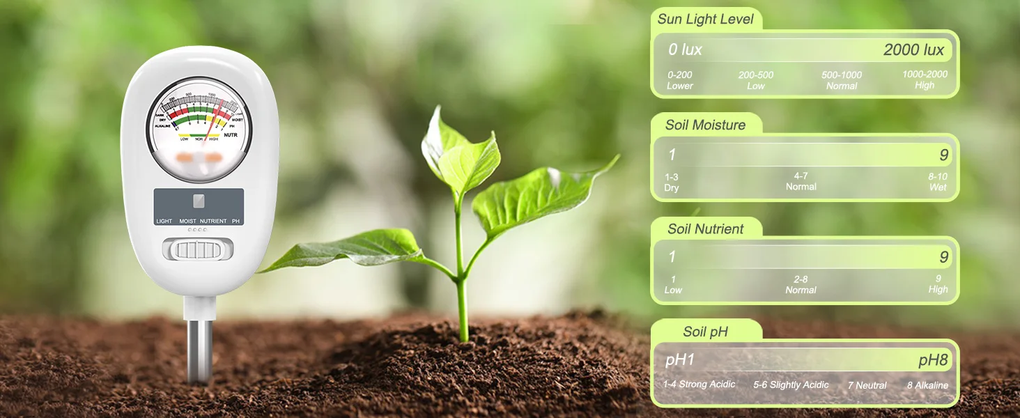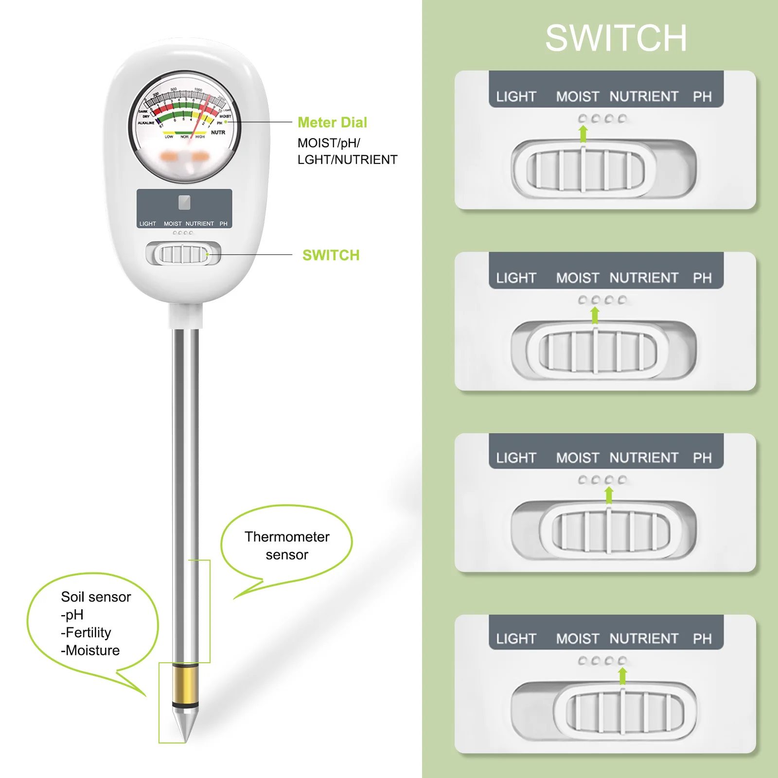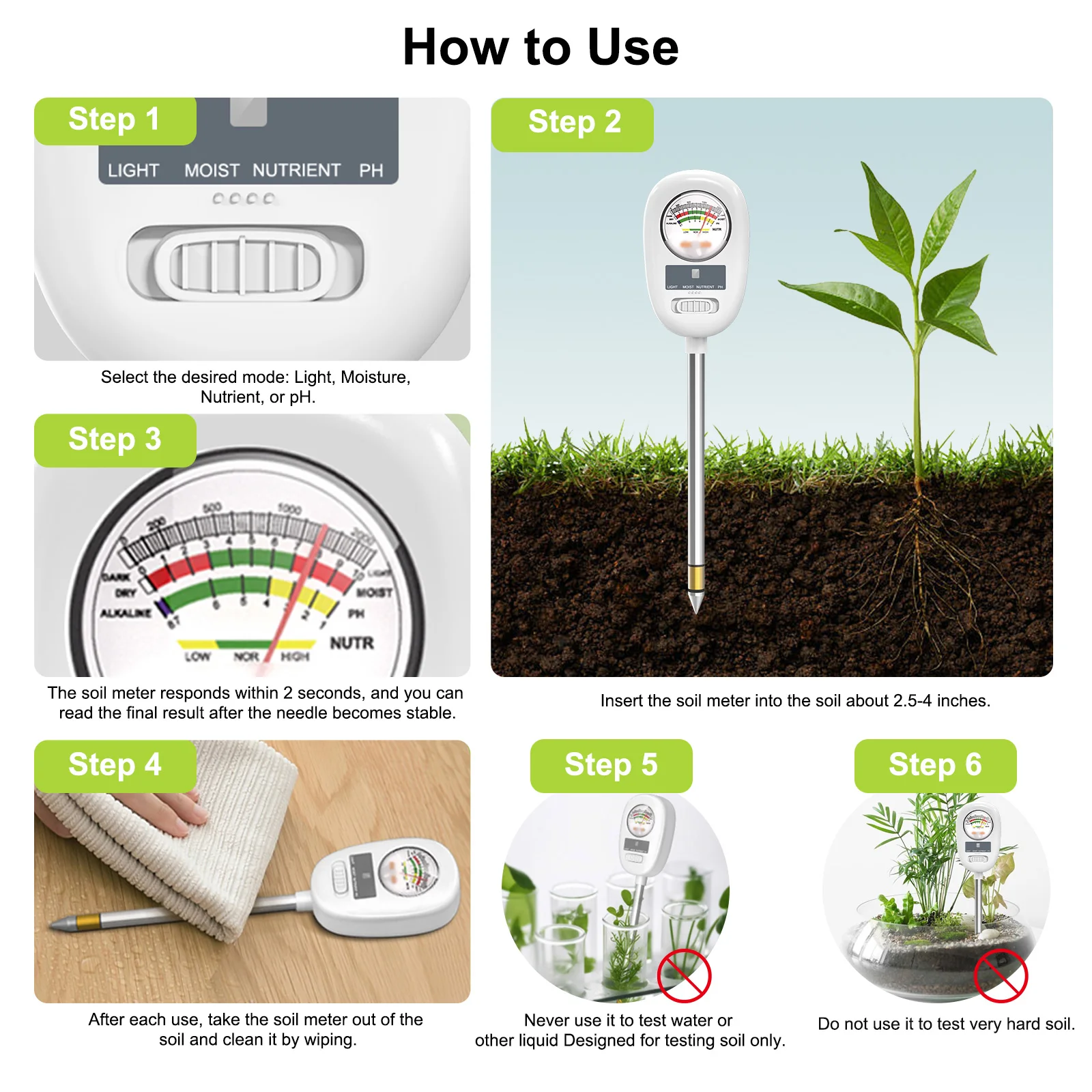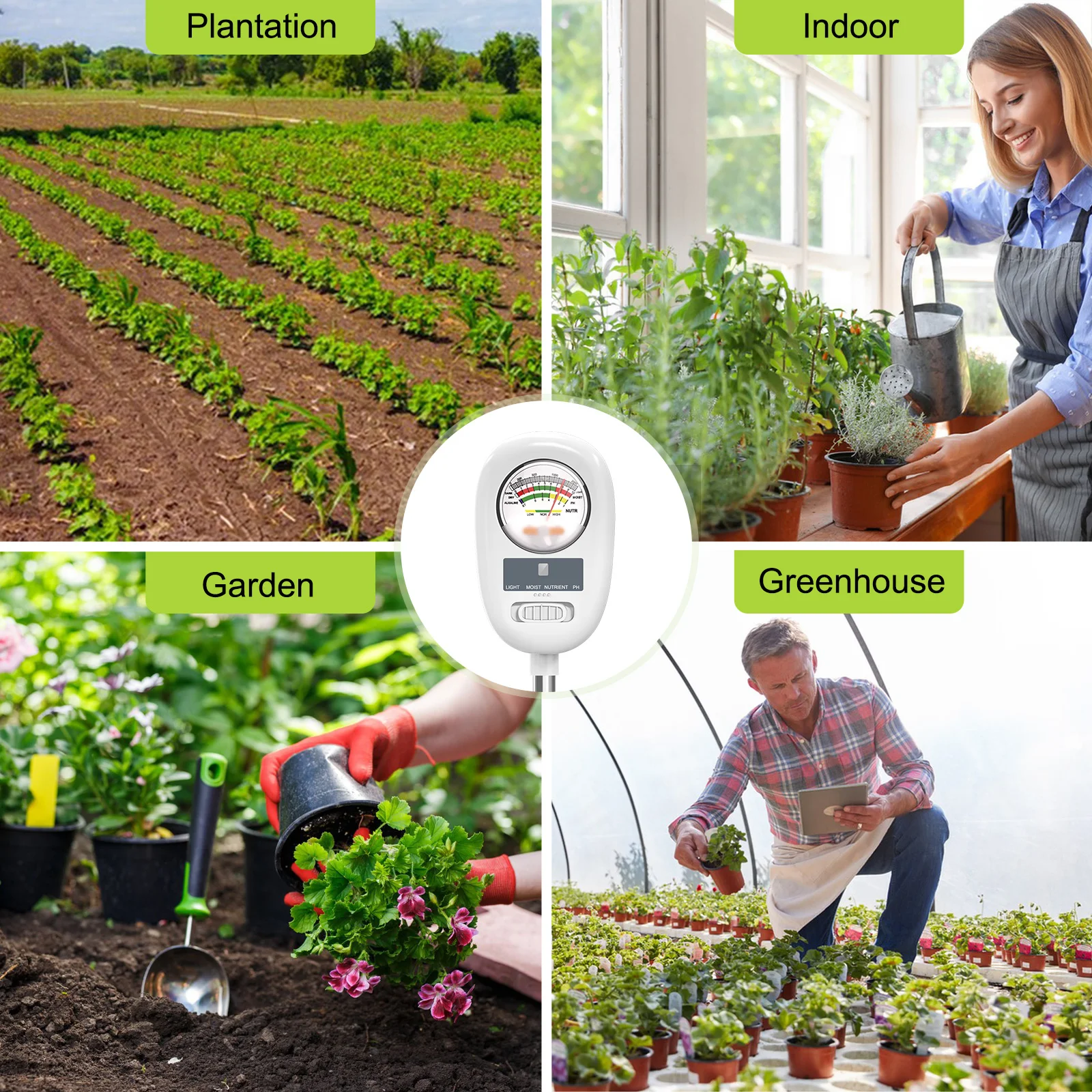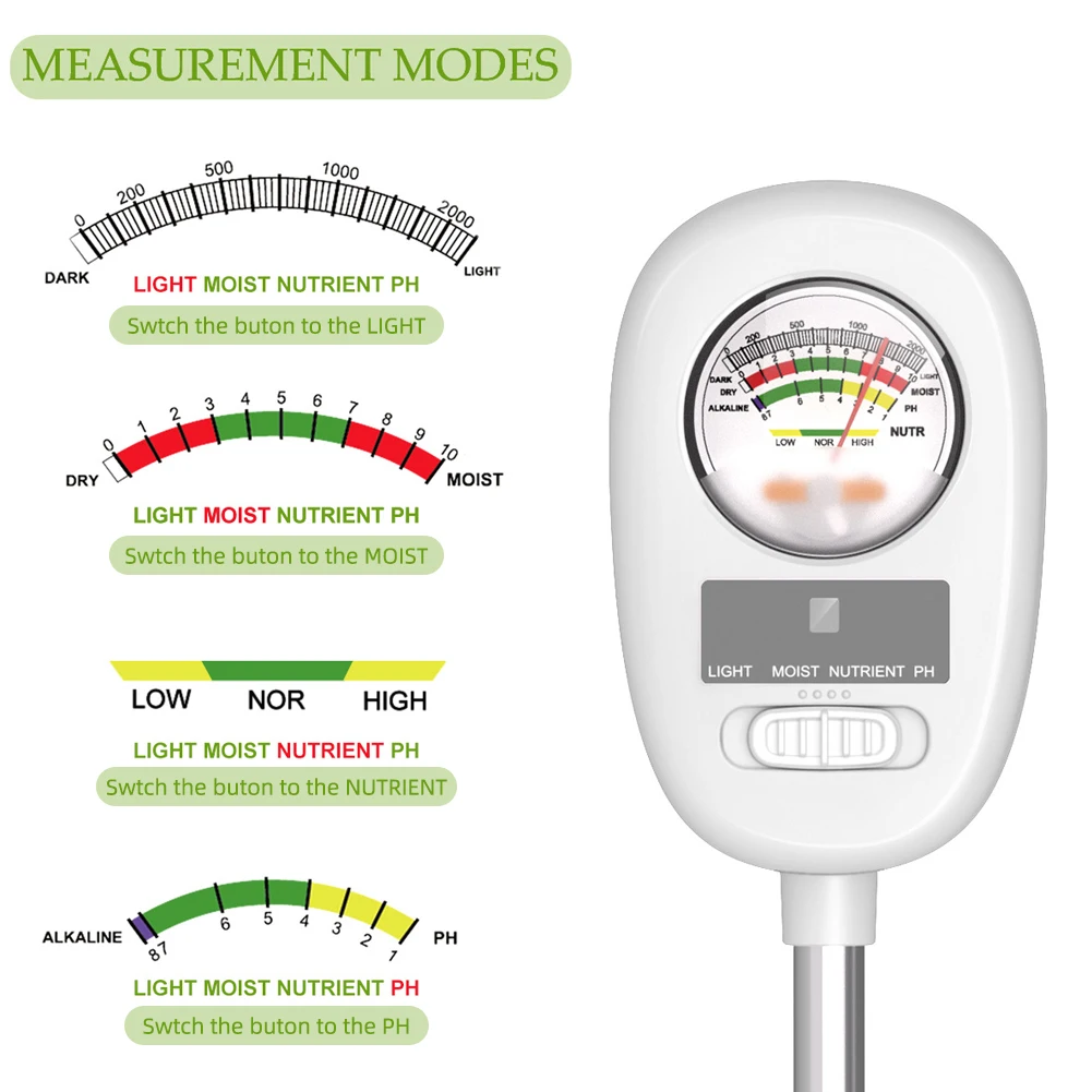 4-in-1 Soil Test Kit: Our 4-in-1 Soil Tester offers a complete solution to measure soil moisture, pH, nutrient levels, and light conditions simultaneously. Unlike single-function testers, you only need one tool to gain a full understanding of your plants. It empowers you to provide precise water, fertilizer, and light, fast-tracking your path to a thriving.