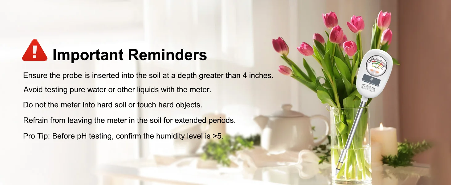 Reliable and Accurate: Our soil tester delivers rapid, accurate results with ease. Simply insert the probe at least 2.5 inches into the soil, and within seconds, you'll have your readings. Its high-quality single-probe design ensures both reliability and accuracy while minimizing potential harm to plant roots. Effortless testing for superior gardening results.