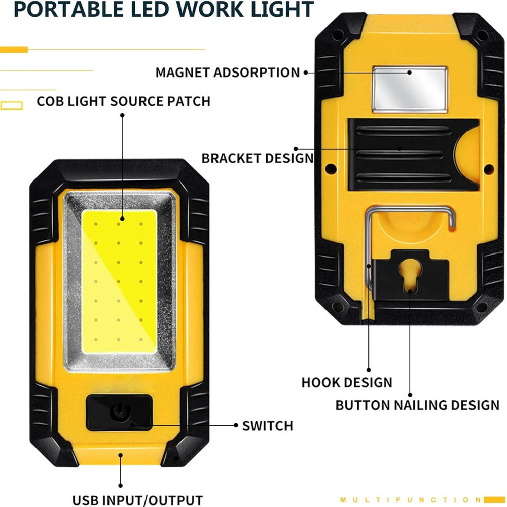 It has a strong magnet at the bottom of work light, which can attach the surface of iron. It has a hook that allows the lamp to be hung on objects such as tents.