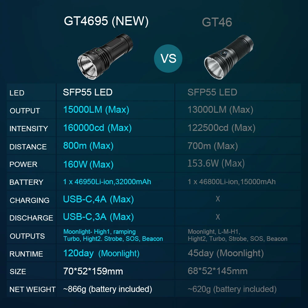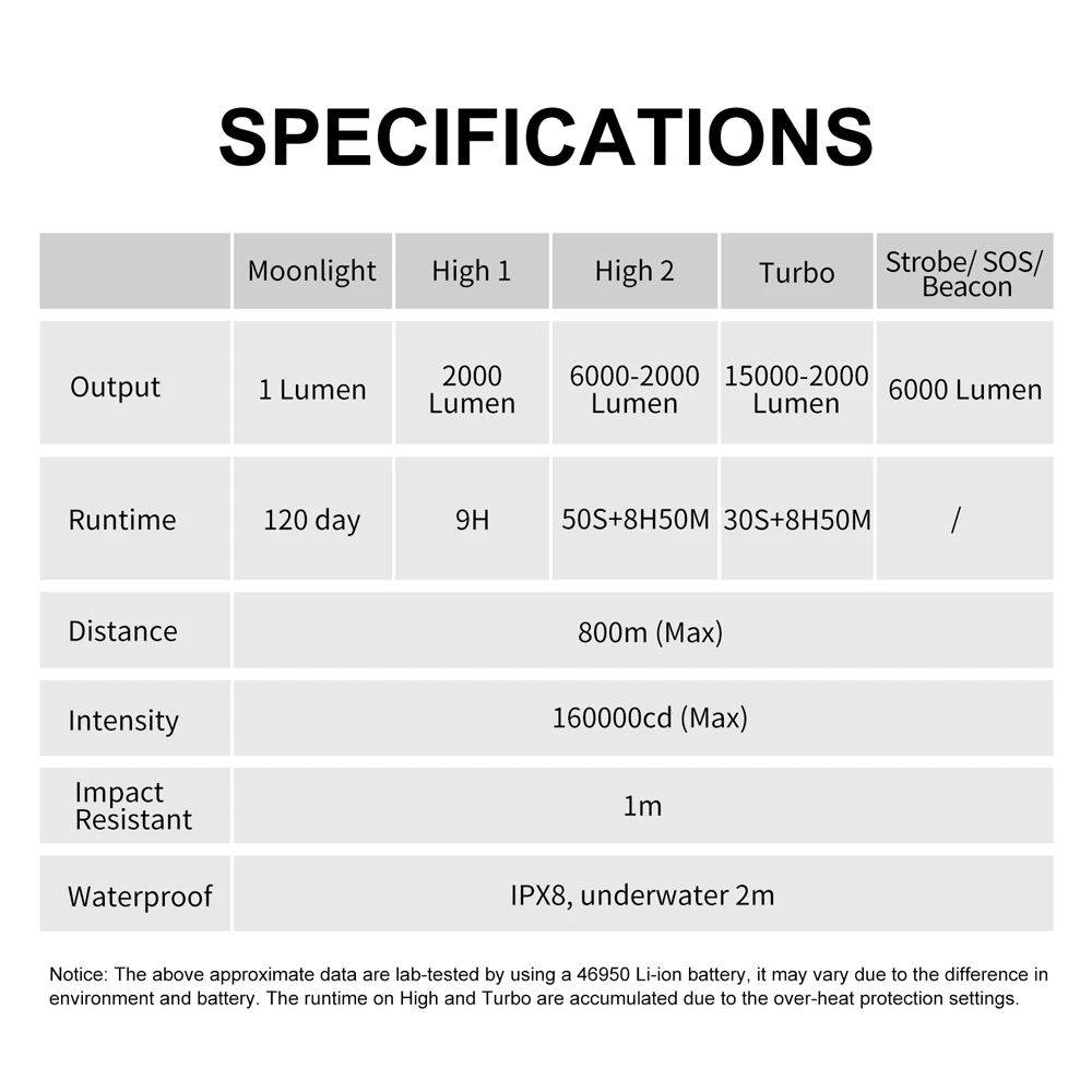 1.Output: Moonlight; High 1; High 2; Turbo; Strobe/SOS/Beacon