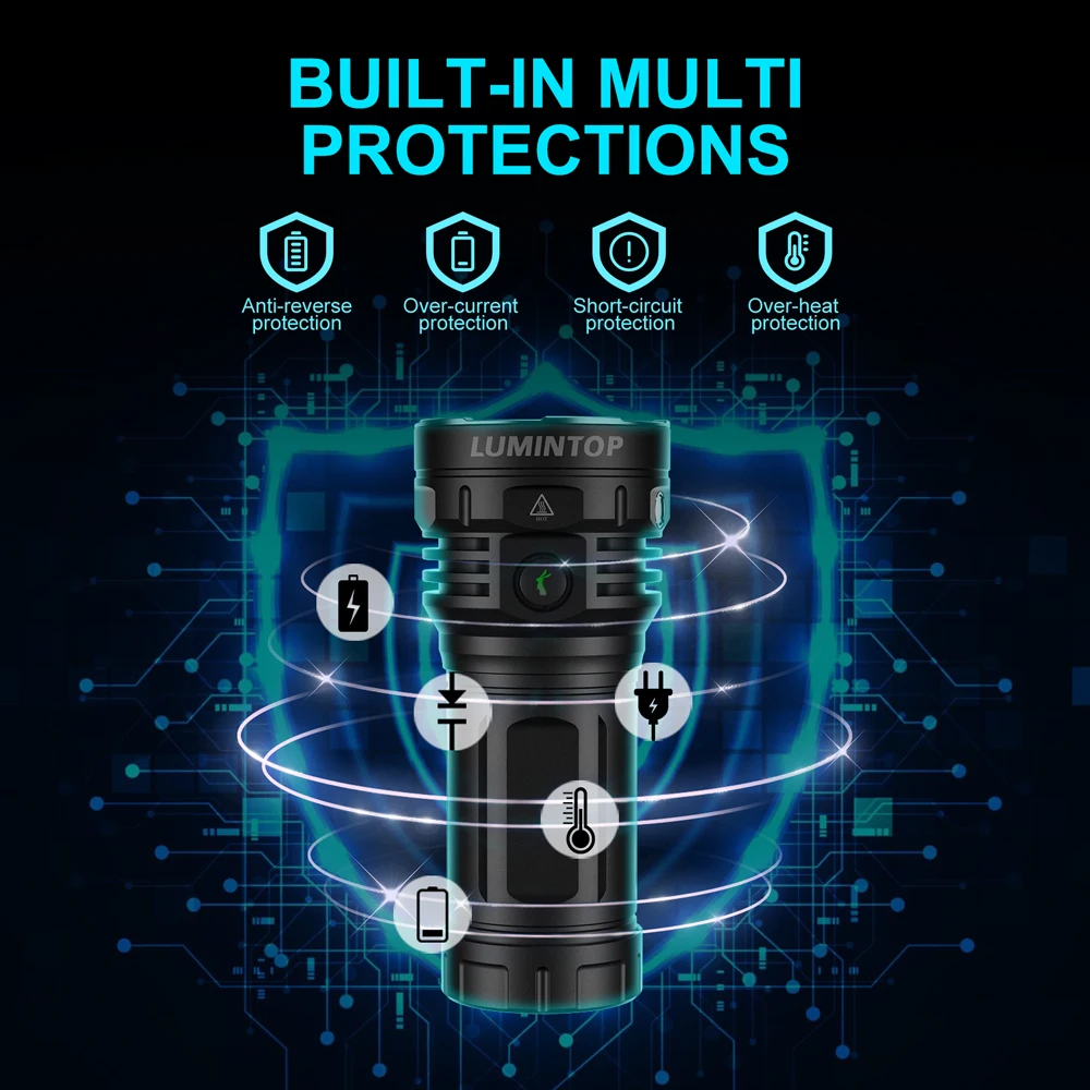 3.Reverse protection to prevent the flashlight from being damaged from the battery reverse installation and short circuit.