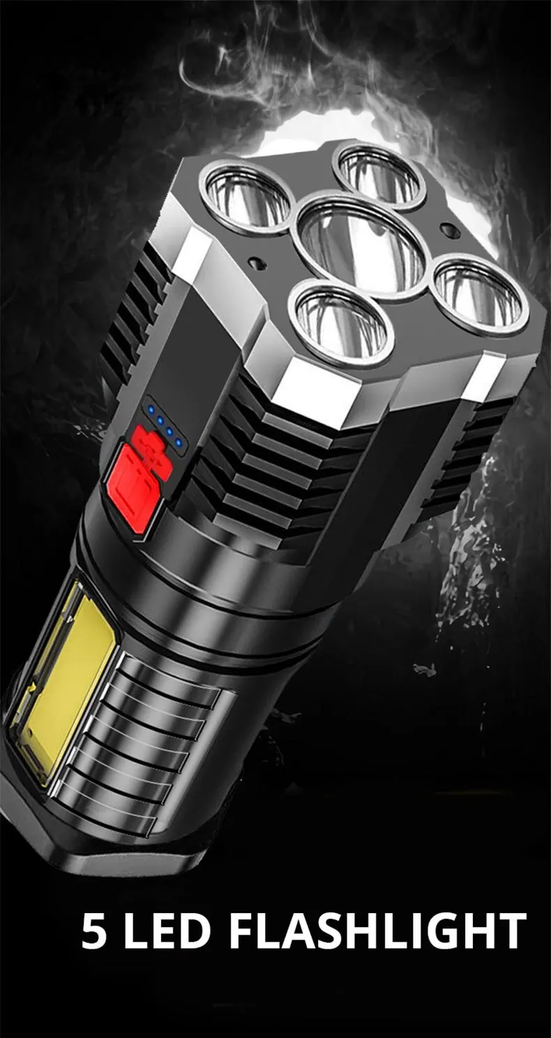Using high-quality synthetic plastic, durable, hard, not easy to damage, and light weight, the front 5 LED lamp beads, the brightness is extremely high, easy to illuminate about 100 meters. Equipped with a COB side light, which can be used as a flood light