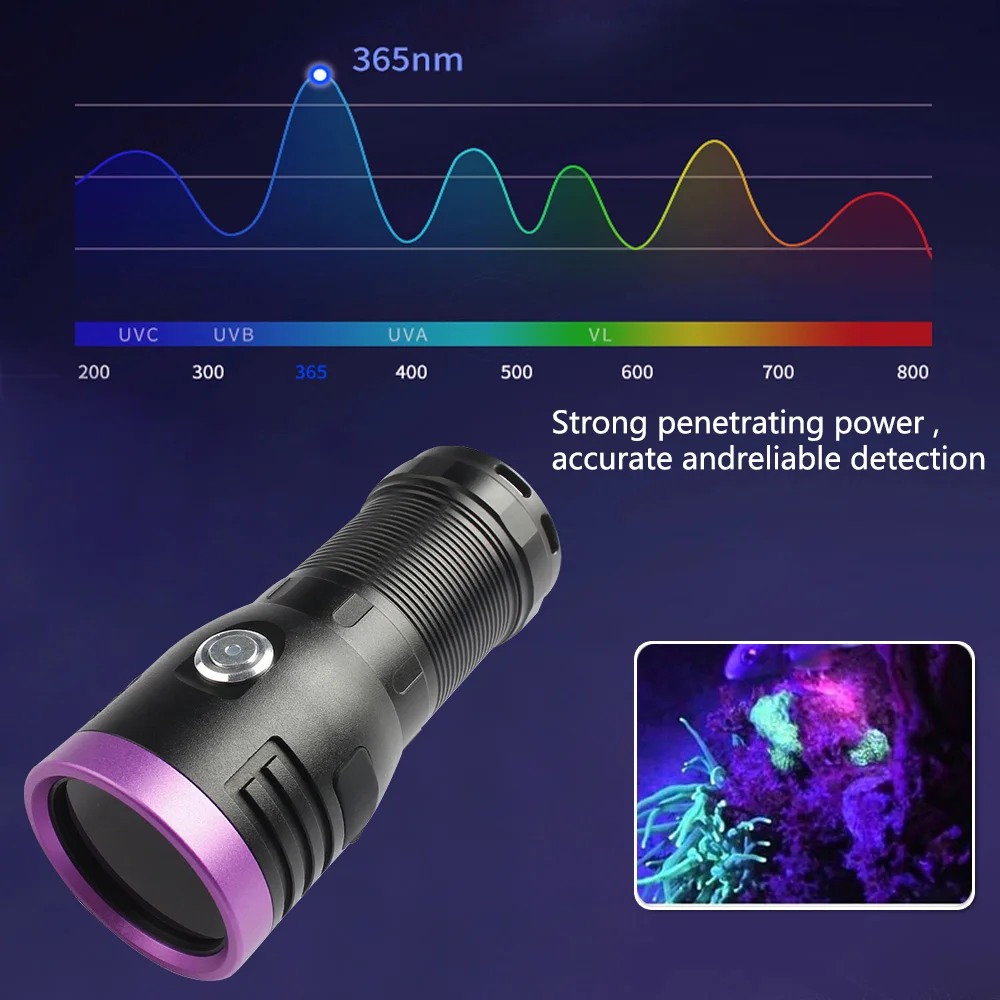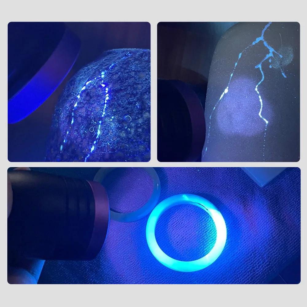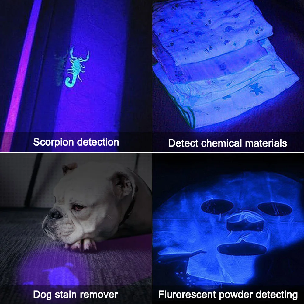 Application field: Ultraviolet flashlight can be used as pet (dog/cat) urine detector/scorpion detector/fluorescence/detector/currency/license/card/passport certification/oil/leak detector/ore/antique identification/UV glue curing.