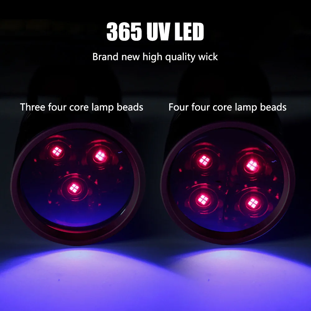 Light bulb: 3 Leds four-core * 365nm UV light,4 Leds four-core * 365nm UV light,6 Leds four-core * 365nm UV light