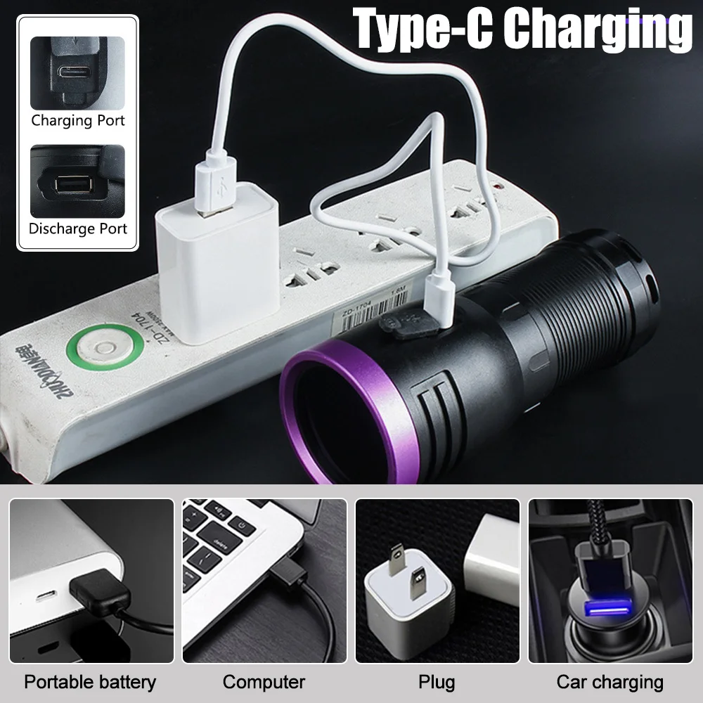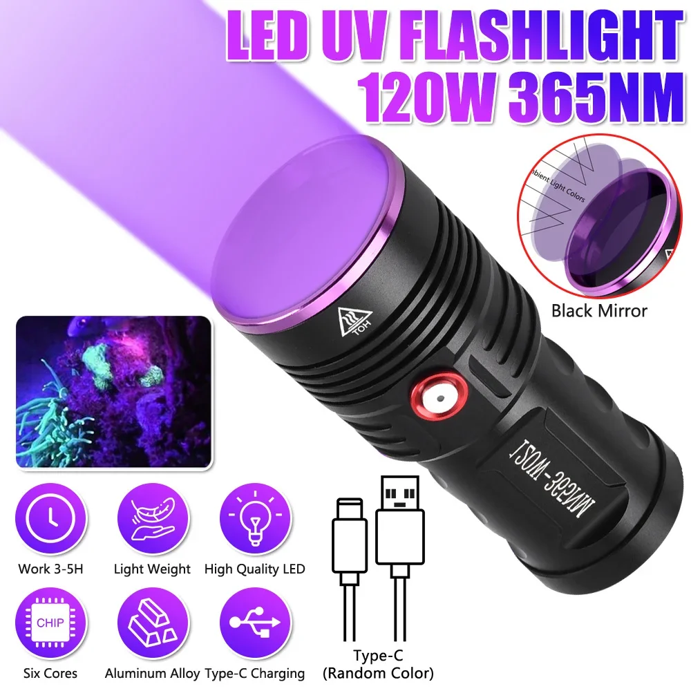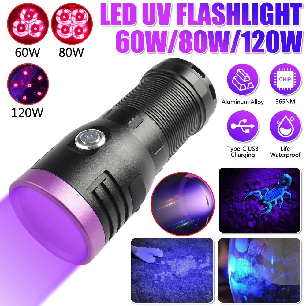 60W/80W/120W High Power LED H4 UV Flashlight Type-C Rechargeable Portable Waterproof 18650 UV Light Torch Wood's UV Flashlight