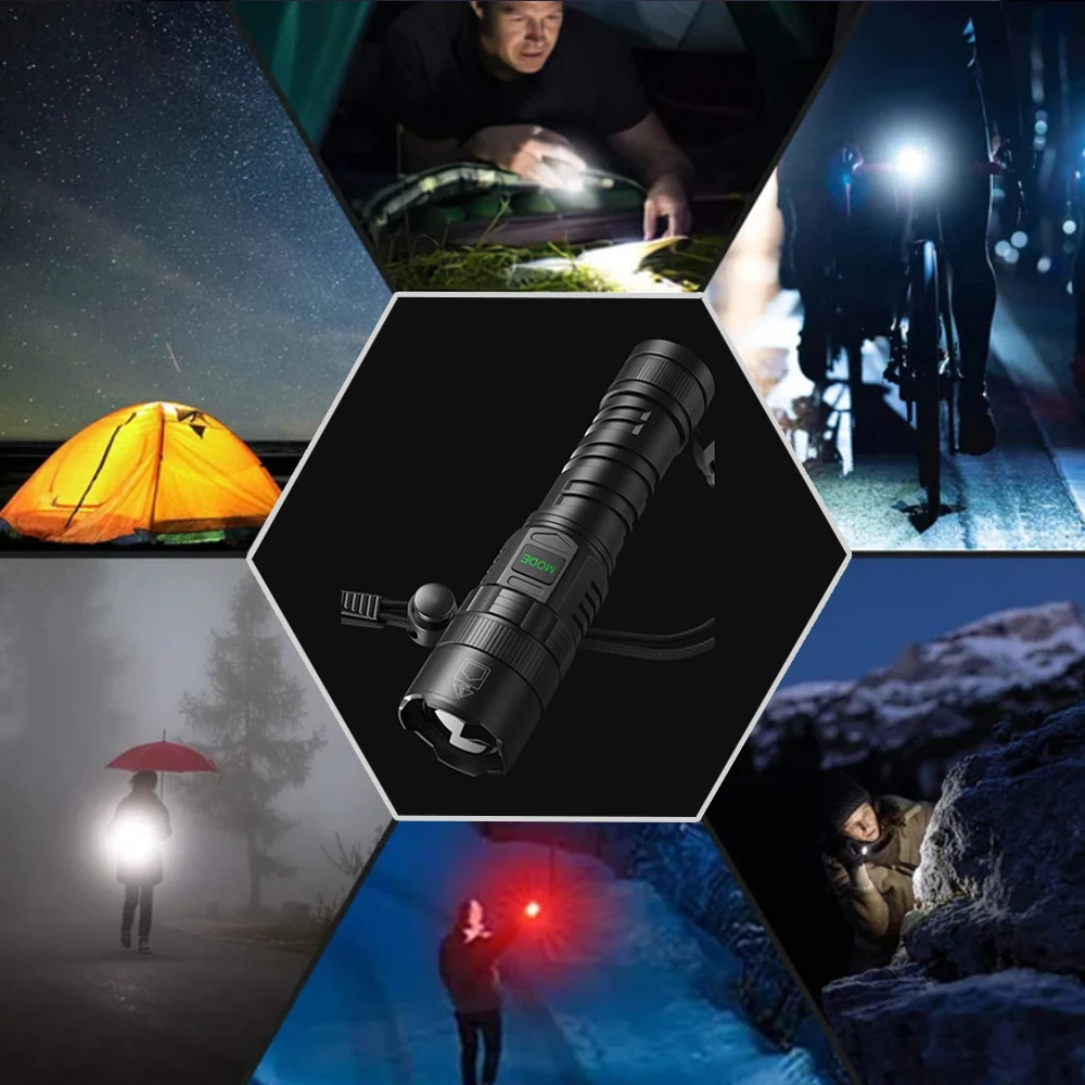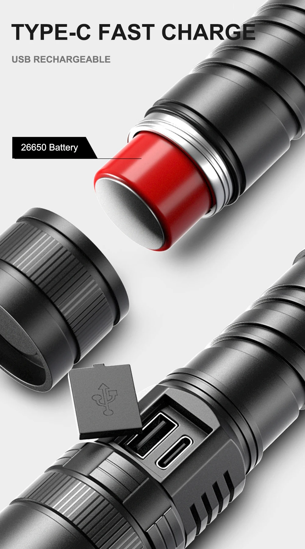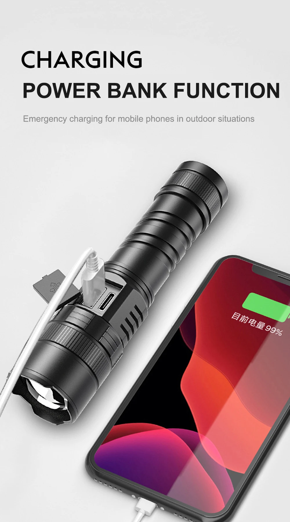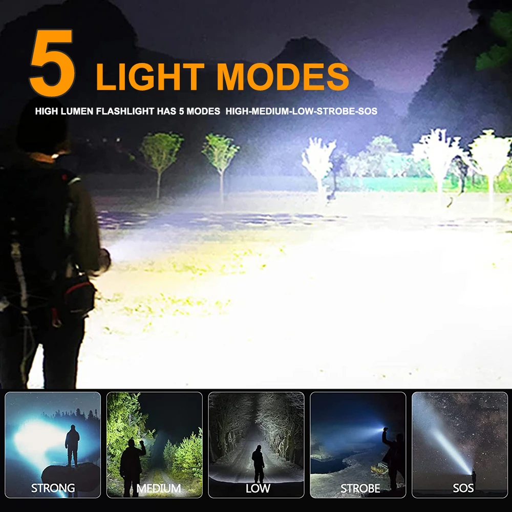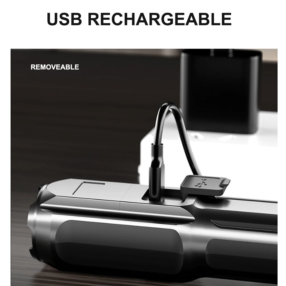 3.26650mAH LITHIUM BATTERY – Large capacity battery, the use time can reach 8-12 hours. Equipped with a USB cable and micro input port, allows you to charge the flashlight conveniently. It can be used as a mobile power bank when the power of mobile phones is cut off.