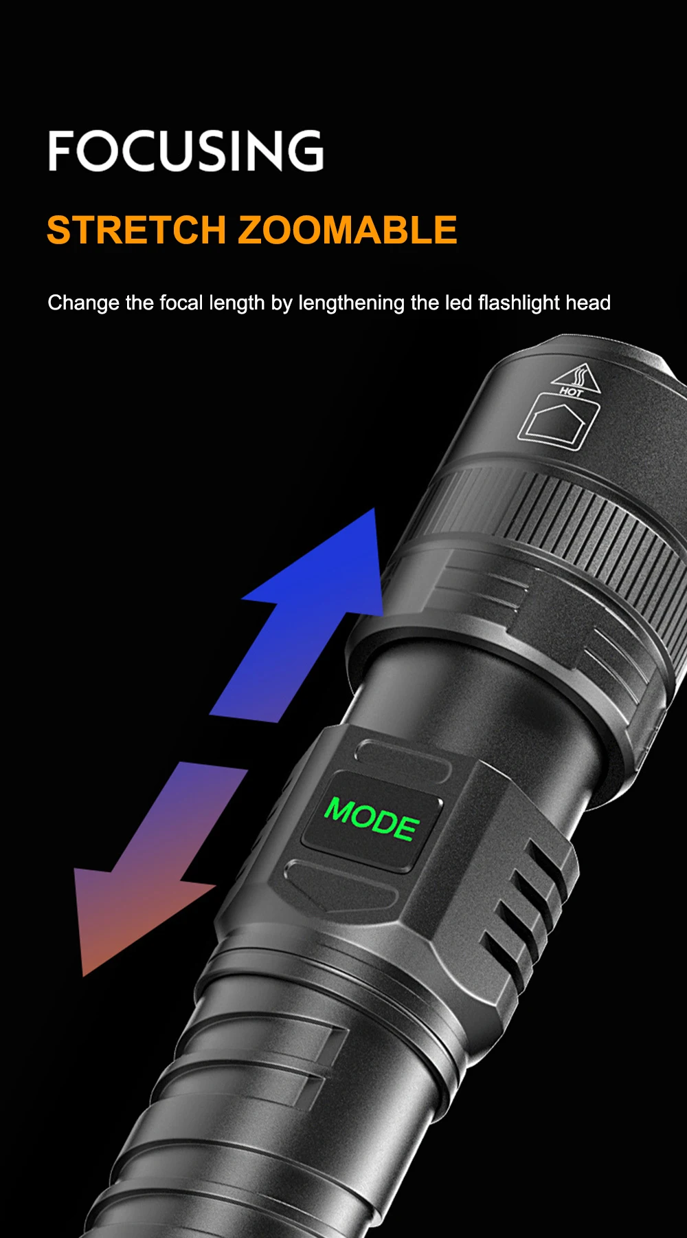 2.5 LIGHT MODES – High / Medium / Low / Strobe/SOS. You can change the light mode easily by pressing the switch button gently. Stretch the head of the flashlight to change the focal length and the size of the beam.