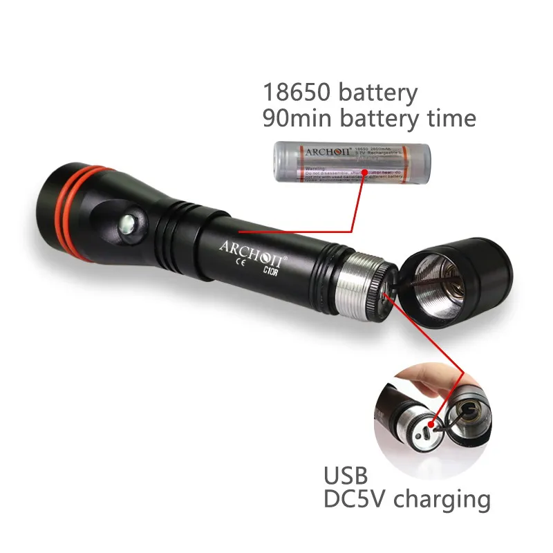 ARCHON C10R USB Charging 1200 lumens diving lighting flashlight powered by 18650 battery Underwater 100m diving flashlight IP68 waterproof diving light