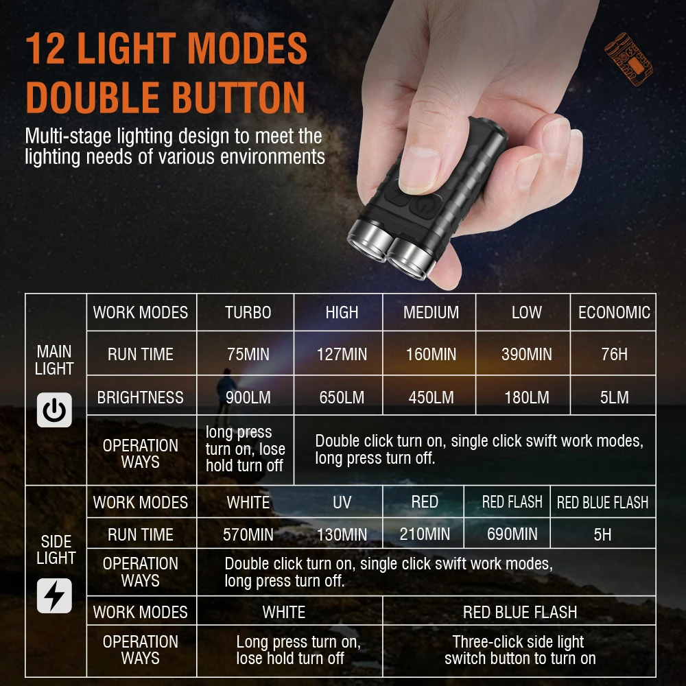 ▪▪ 12 Lighting Modes: This small keychain flashlight offers versatile lighting with 5 modes for the main light (super bright, high, medium, low, economic) and 7 modes for the side light (white light, UV, red light, red light flash, red-blue light flash). It meets a range of requirements, including emergencies, and is bright enough for daily use even in low-light mode.