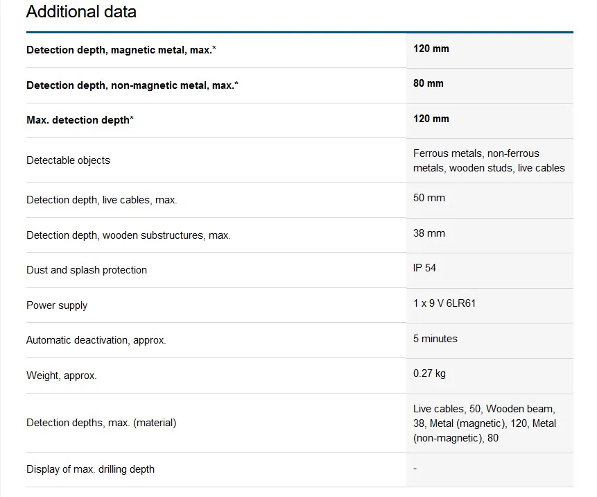 The D-tect 120 Professional offers a simple user interface with three self-explanatory selection buttons for adjusting to various applications and it is able to detect objects at depths of up to 12 cm. Audio and visual signals notify the user when objects are detected in the wall.