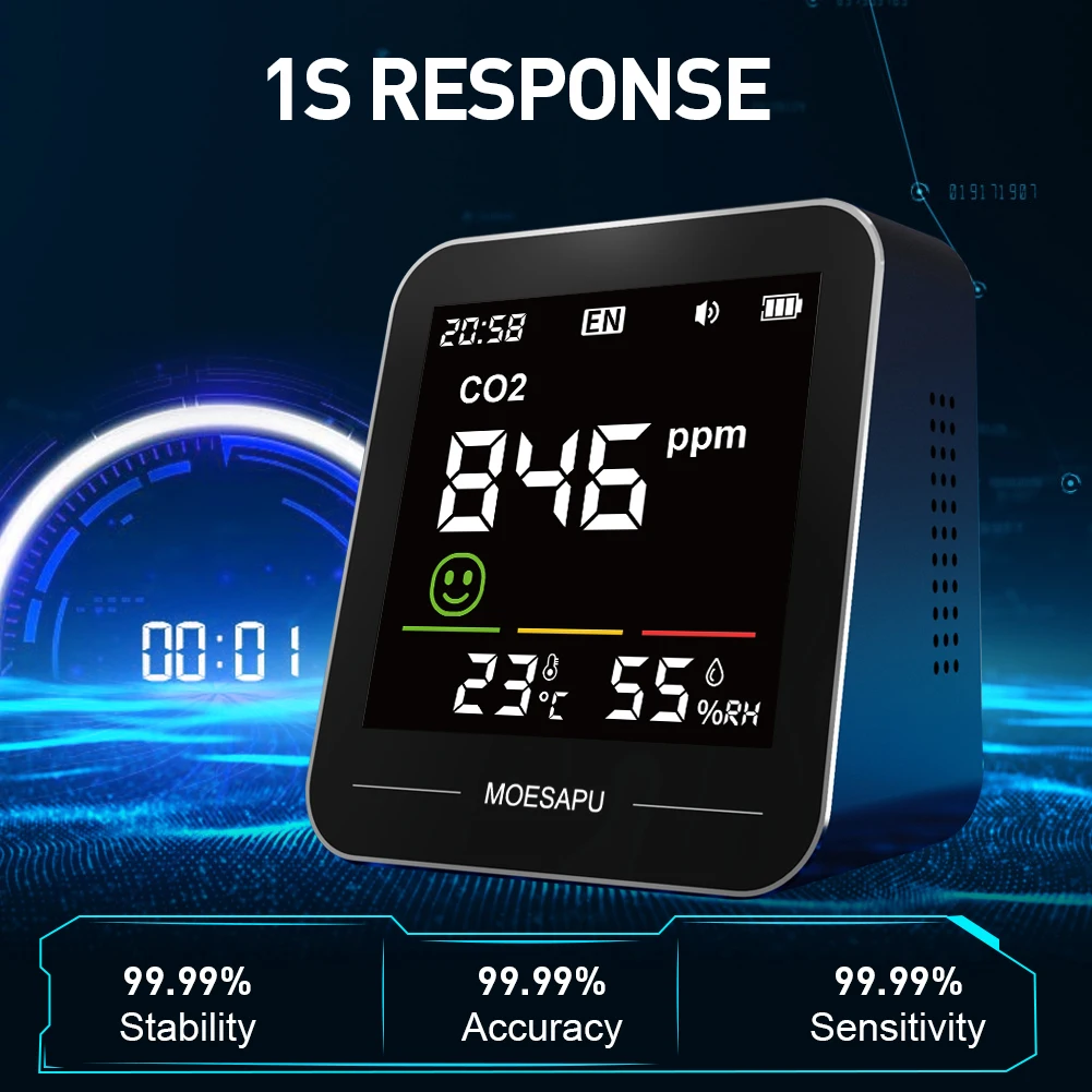 It is a high-performance home air quality detector, mainly used to monitor PM2.5, HCHO, TVOC, CO and CO2 gas concentrations, and temperature and humidity. The instrument is equipped with a 3.2-inch color LCD display and a live voice alarm prompt. The instrument keeps data records for the last 8 hours and can be viewed through the history interface.