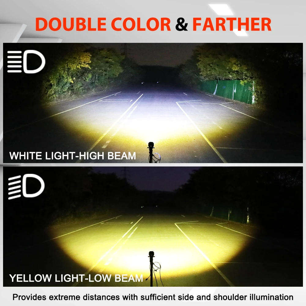 Light Color: White + Yellow Power: 48W. Brightness: 40000LM Voltage: DC (9-32V) 12V, 24V vehicles IP68 rated water and dust seal Aviation 6063 Aluminum Profile > 50000hrs Lifetime (-40,+80) degree working temperature