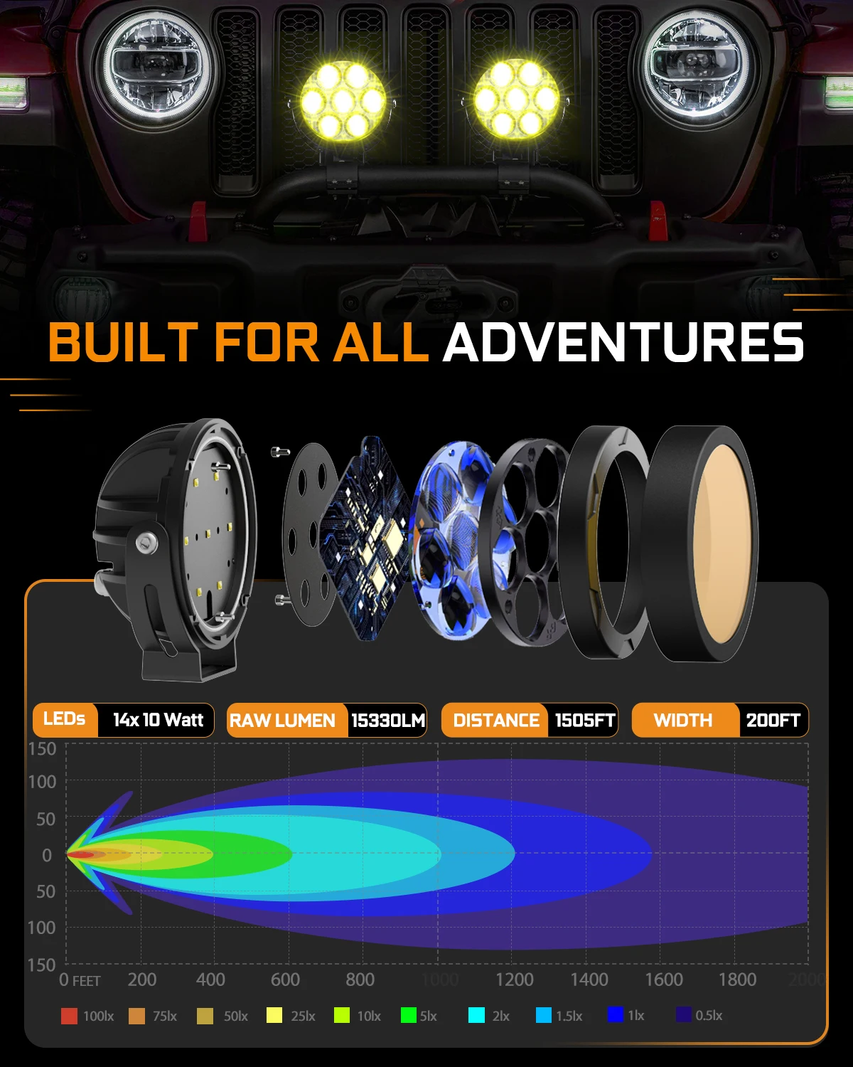 Package: 1 Piece Light Color: White +Yellow Beam Type: Spot Light Power: 100W/pair Brightness: 100000LM/pair Voltage: DC (10-80V) IP68 rated water and dust seal Aviation 6063 Aluminum Profile > 50000hrs Lifetime (-40,+80) degree working temperature