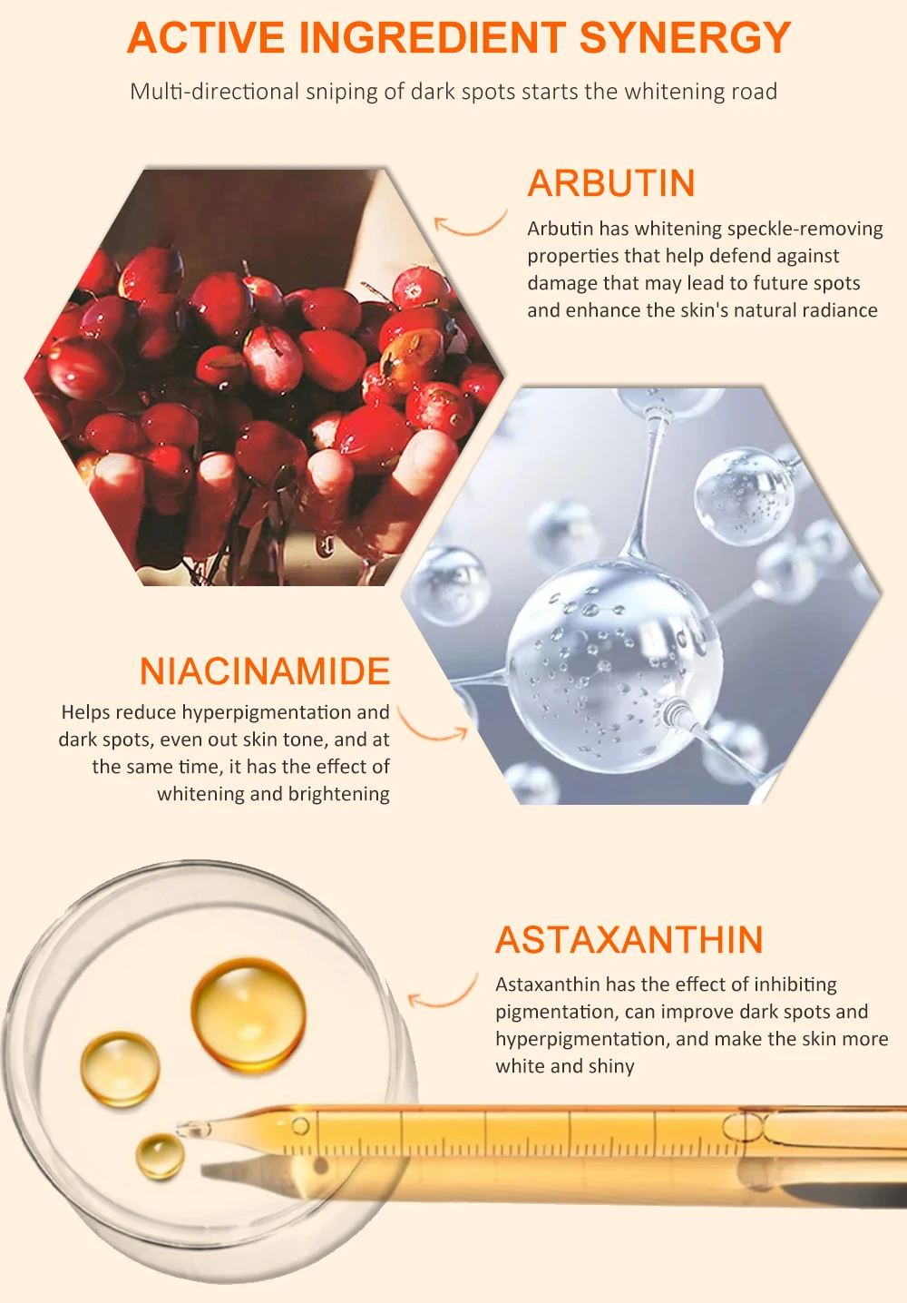 MAIN INGREDIENTS: Vitamin C, Niacinamide, Kojic Acid, Astaxanthin, Arbutin…