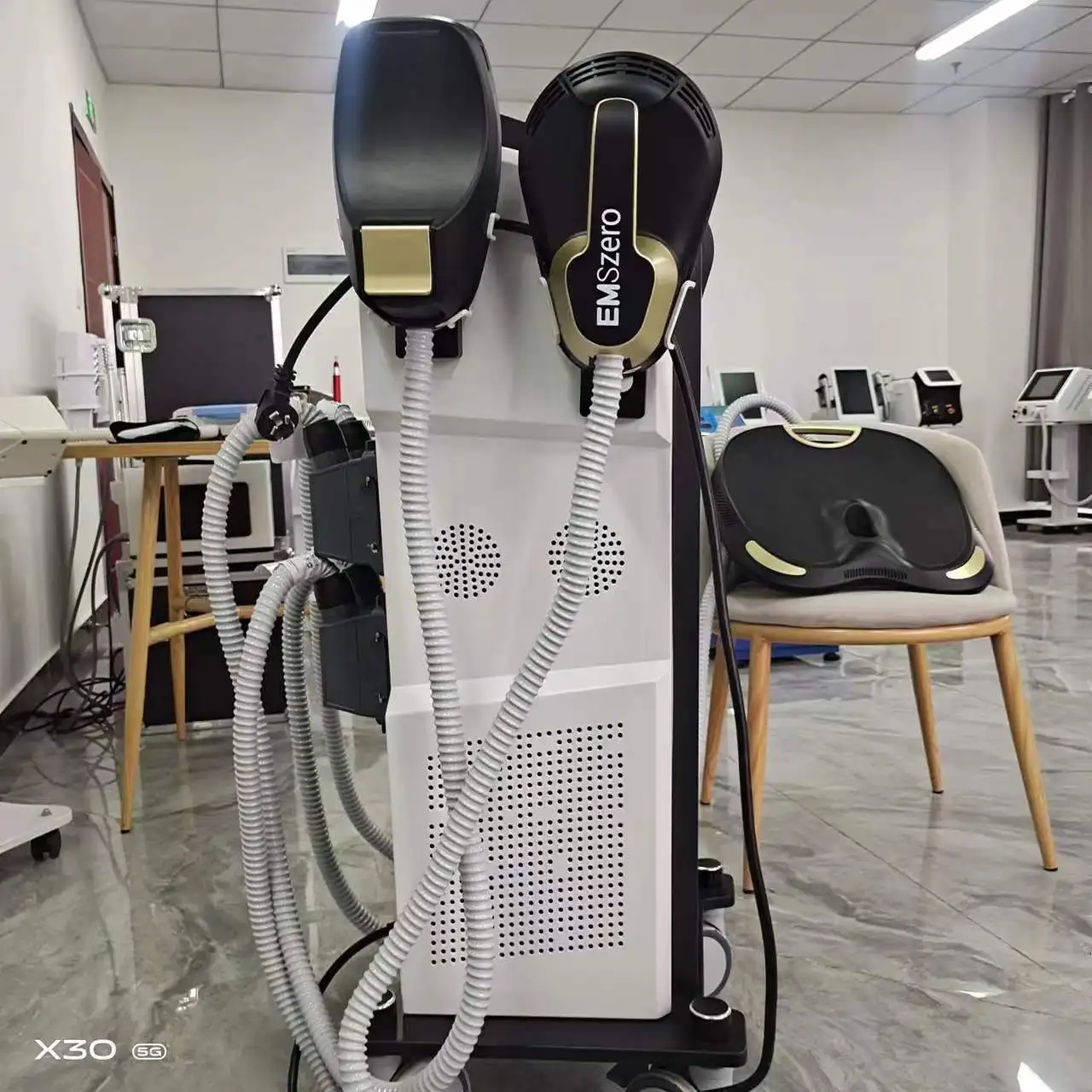 The unit has 5 optional handles, 4 RF handles and a pelvic stimulation pad. The role of the pelvic stimulation pad is to repair the pelvic cavity