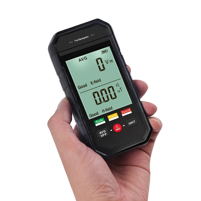 Radiation assessment function, which can indicating if current radiation value is at safety level, three color light indicating the current magnetic field states: safety, alert, avert, and if the electric field data over the safety state, the screen will become red to alarm you.