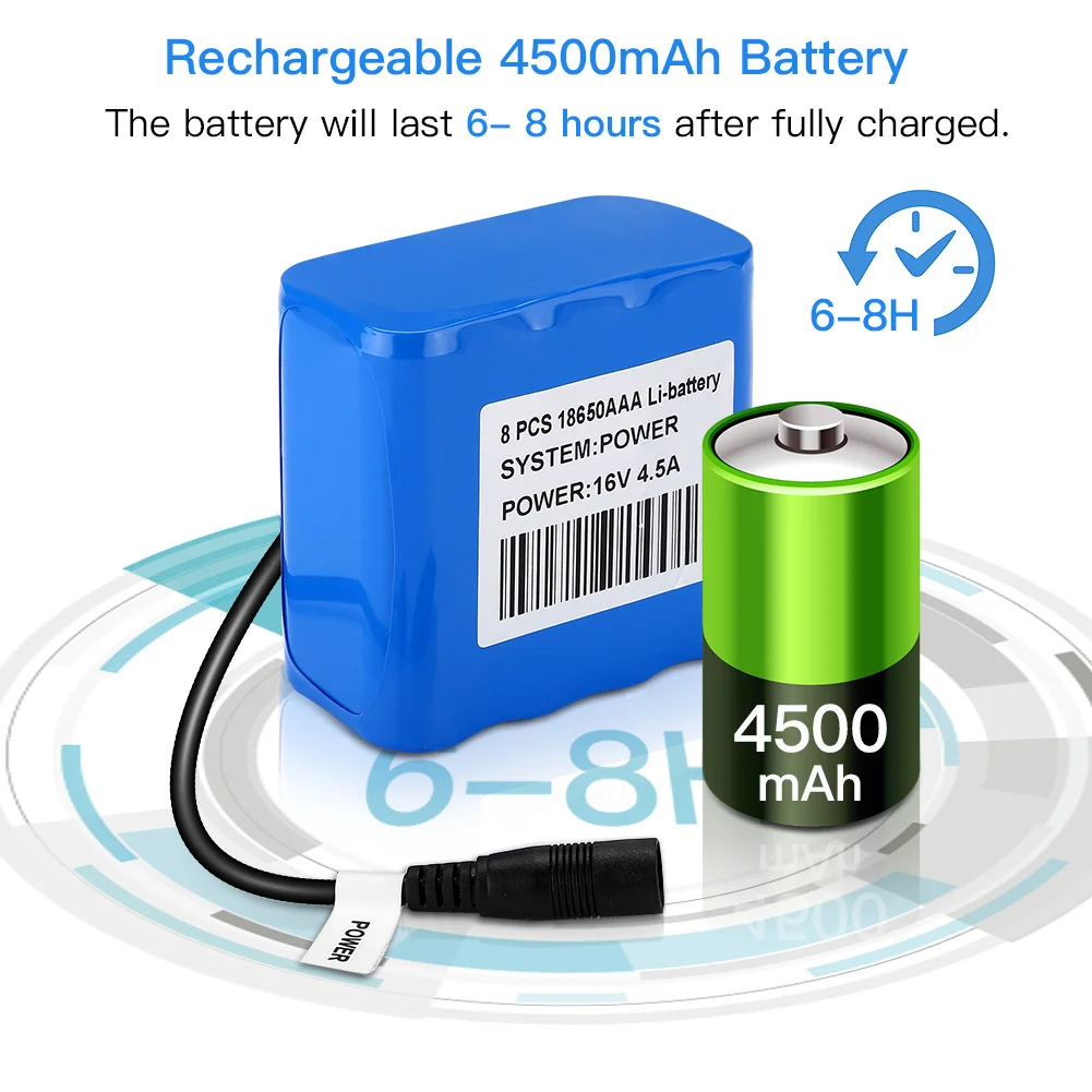 7. 4500mAh large capacity rechargeable battery, 6-8 hours continue working at full charged. With certified power adapter, more safe and faster charging.