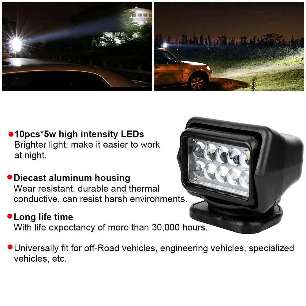 LED Power– 10x 5w high intensity CREE LEDS, Operating Voltage: 12V-24V DC.With an illumination distance of up to 200 meters, can clearly illuminate the search target.