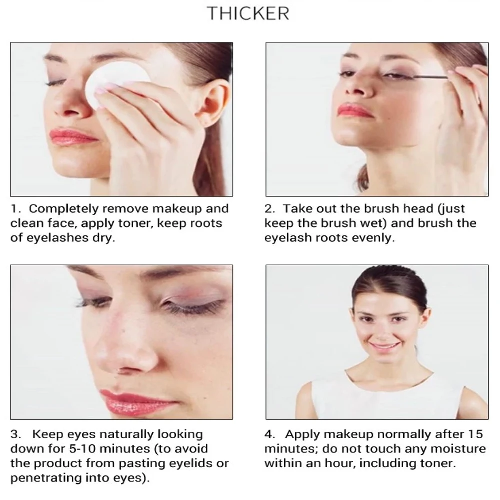 Make sure your face is clean from makeup and creams, and your eyes and lashes are dry. Apply the serum(or any other beauty product) with clean hands. Dip the brush once, remove extra liquid.