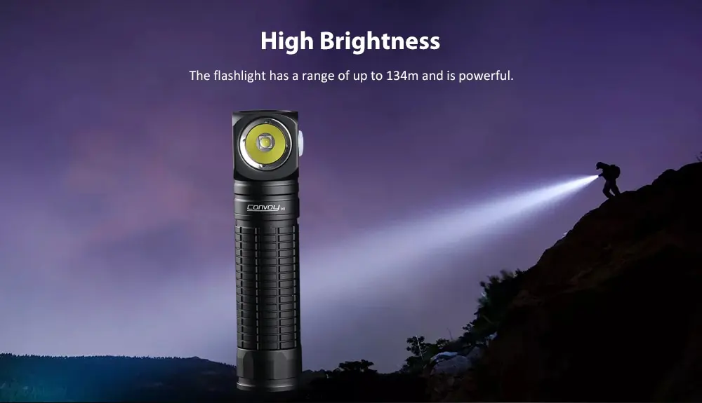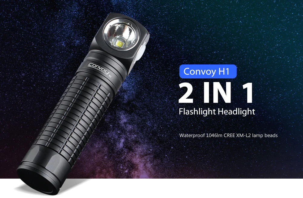 Convoy H1 Flashlight & Headlight, 2-in-1 multifunctional bright light company with you. It can be a flashlight and can also be a headlamp ( with headlamp belt ). Built for rough handling, this flashlight can survive a max beam throw 134m and 1048 lumens for lighting up 20 trees distance. Suitable for use in rain, snow, or emergency situations. The flashlight is ideal for use around the house, dog walking, or camping. It is compact enough to fit in your pocket, backpack, or purse allowing for easy storage and quick access.