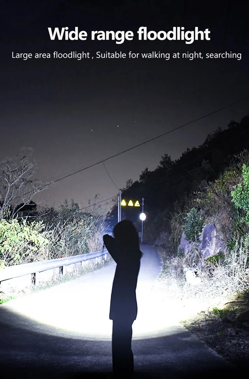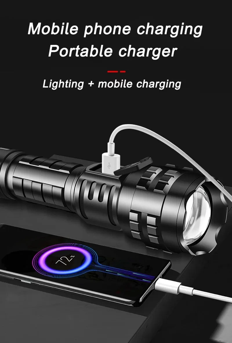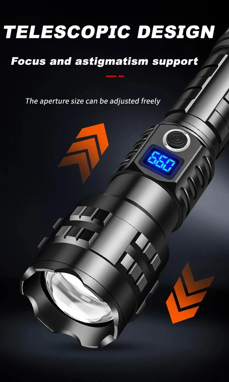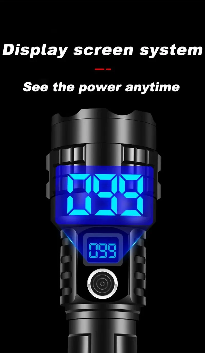 The latest long-range LED flashlight uses a 50W LED wick as the light-emitting point, and the maximum lumens is100000, lumens. It is the flashlight with the longest illumination distance on the market. There are 5 modes, suitable for various places. The flashlight uses 18650 or 26650 batteries and can be used for 6-15 hours on a single charge. With 4-level power display, you can know the remaining power at any time, and use the C-type fast charging charger to charge, and the charging speed is twice that of ordinary chargers. It is a must-have for outdoor activities and a small helper for the family.