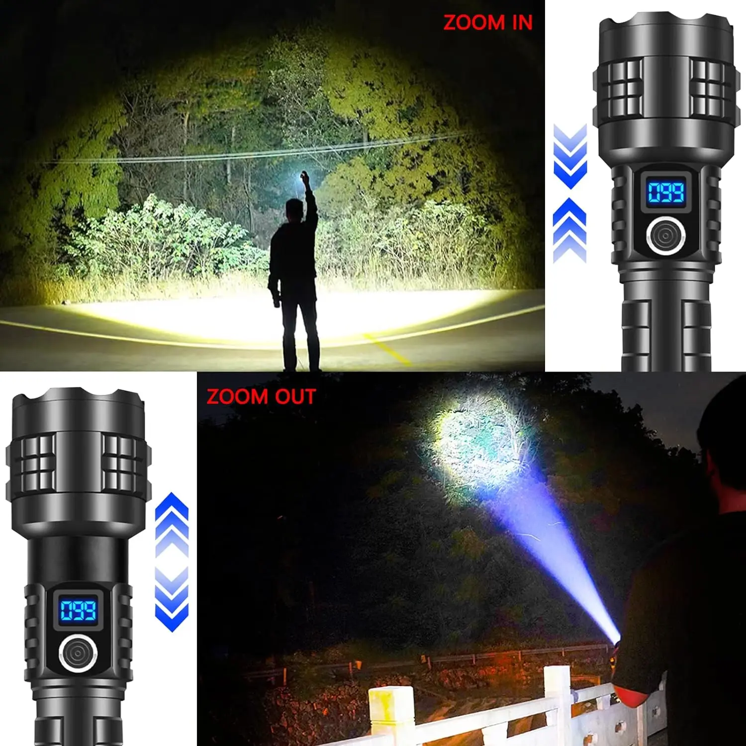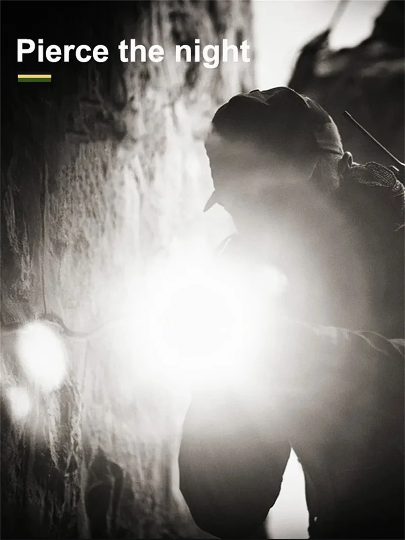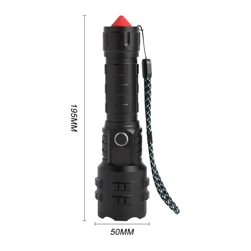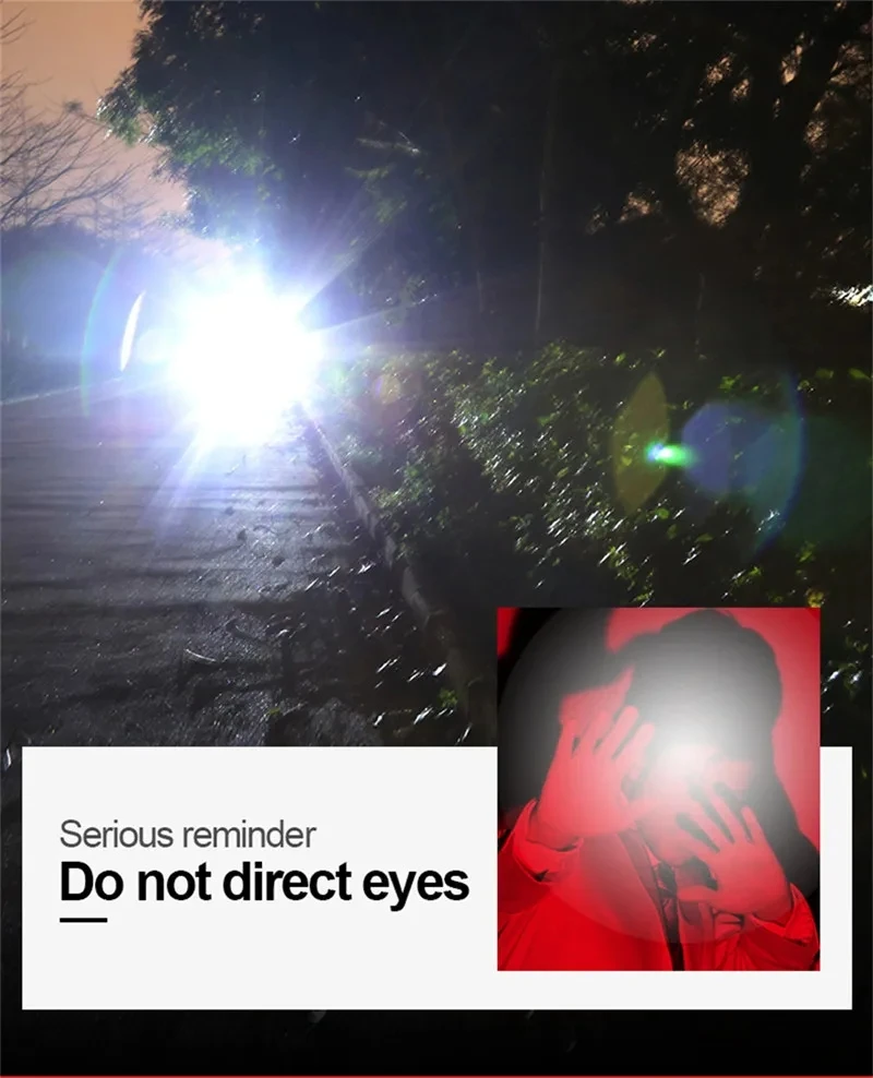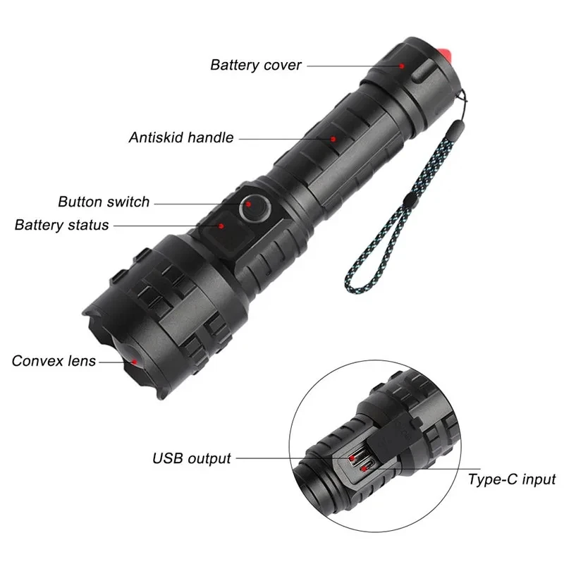 The latest long-range LED flashlight uses a 50W LED wick as the light-emitting point, and the maximum lumens is100000, lumens. It is the flashlight with the longest illumination distance on the market. There are 5 modes, suitable for various places. The flashlight uses 18650 or 26650 batteries and can be used for 6-15 hours on a single charge. With 4-level power display, you can know the remaining power at any time, and use the C-type fast charging charger to charge, and the charging speed is twice that of ordinary chargers. It is a must-have for outdoor activities and a small helper for the family.