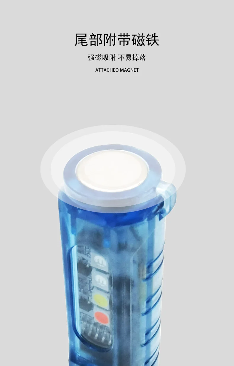 Mini glare key chain light, small and exquisite, small and light;The barrel is as thin as a little finger and weighs only 18 grams, so it can be easily carried with a key chain. The brightness of ultra-bright mode is 400lm, and the battery life of energy-saving mode is 32 hours, which can meet the needs of daily instant lighting;