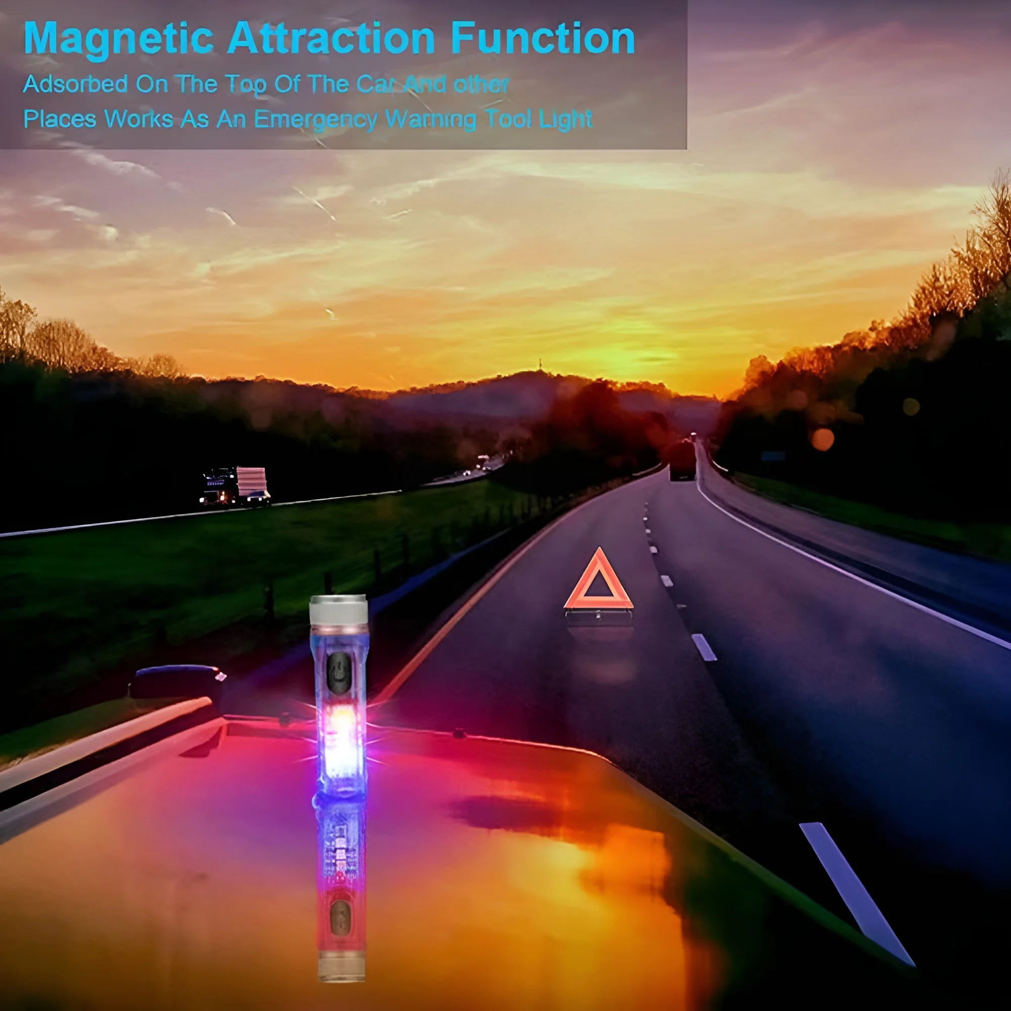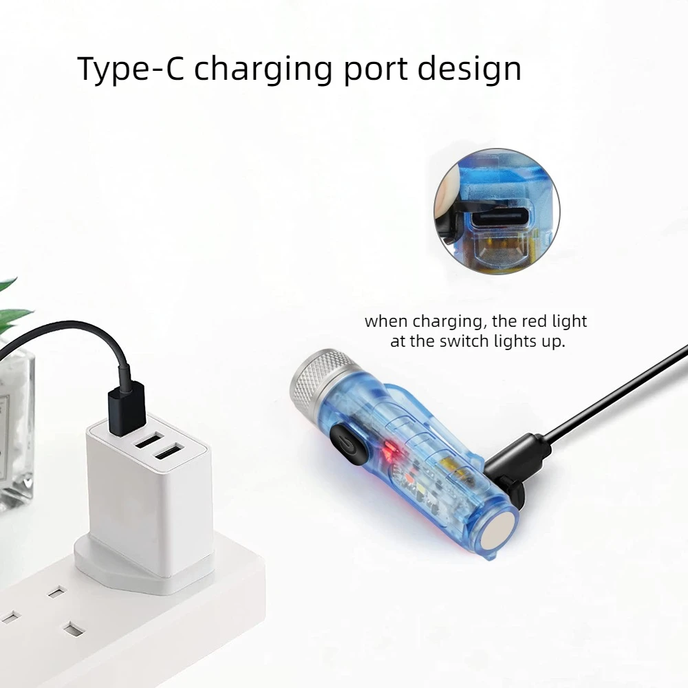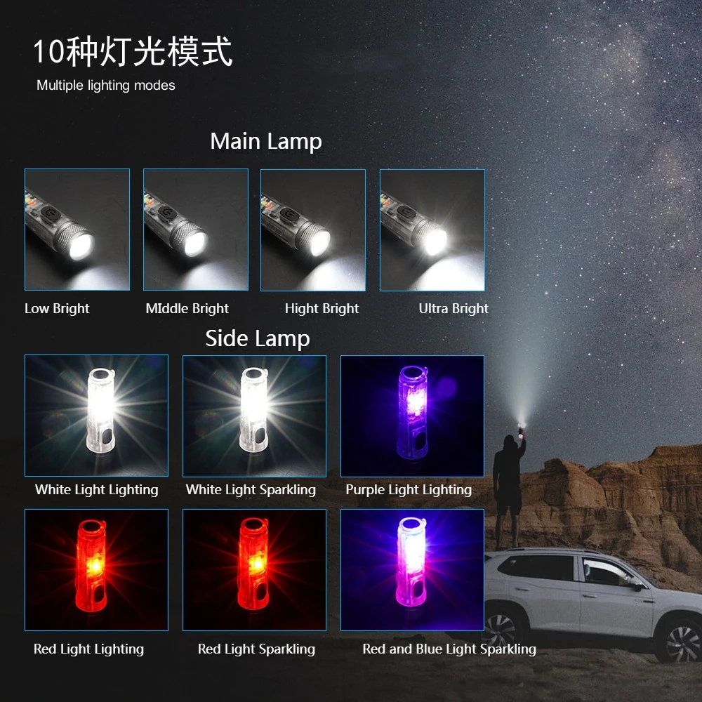 The side lamp is purple light, which can be used for daily banknote inspection or fluorescent agent detection; The tail has a magnetic attraction function, which is combined with the warning flash of the side lamp and adsorbed on the roof and other places to become an emergency warning tool lamp; Built-in 300mAh li-polymer can be fully charged within 35 minutes through Type-C interface; The product integrates a variety of practical functions; It is an ideal mini lighting tool for daily carrying.