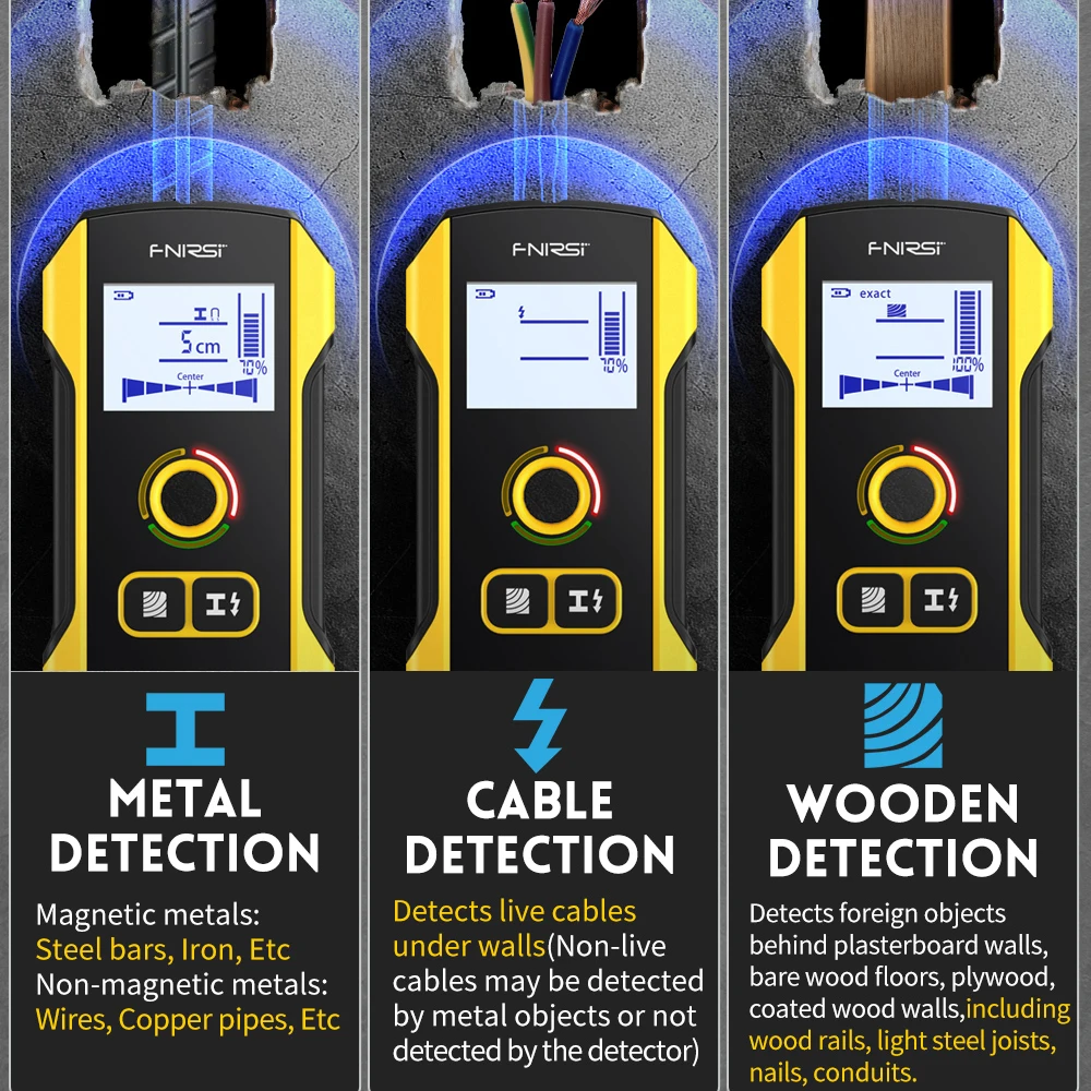 This wall detector scanner can help you to quick locate edges and center metal, studs, joists, pipes and live AC wire behind walls, floors and ceiling. The measuring ranges of wooden is ≤38mm, AC wires ≤40mm, metal pipes ≤100mm and rebars ≤120mm.