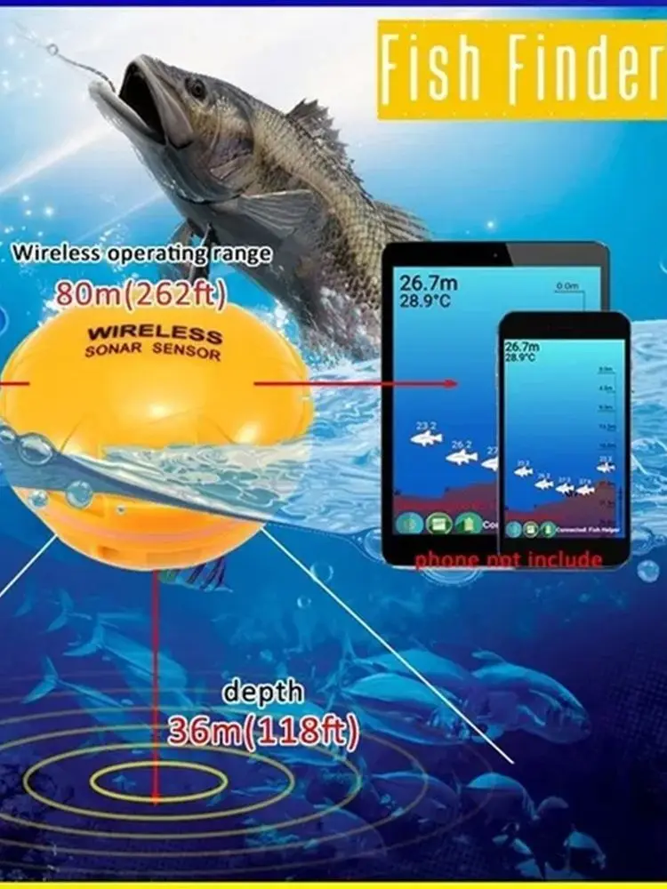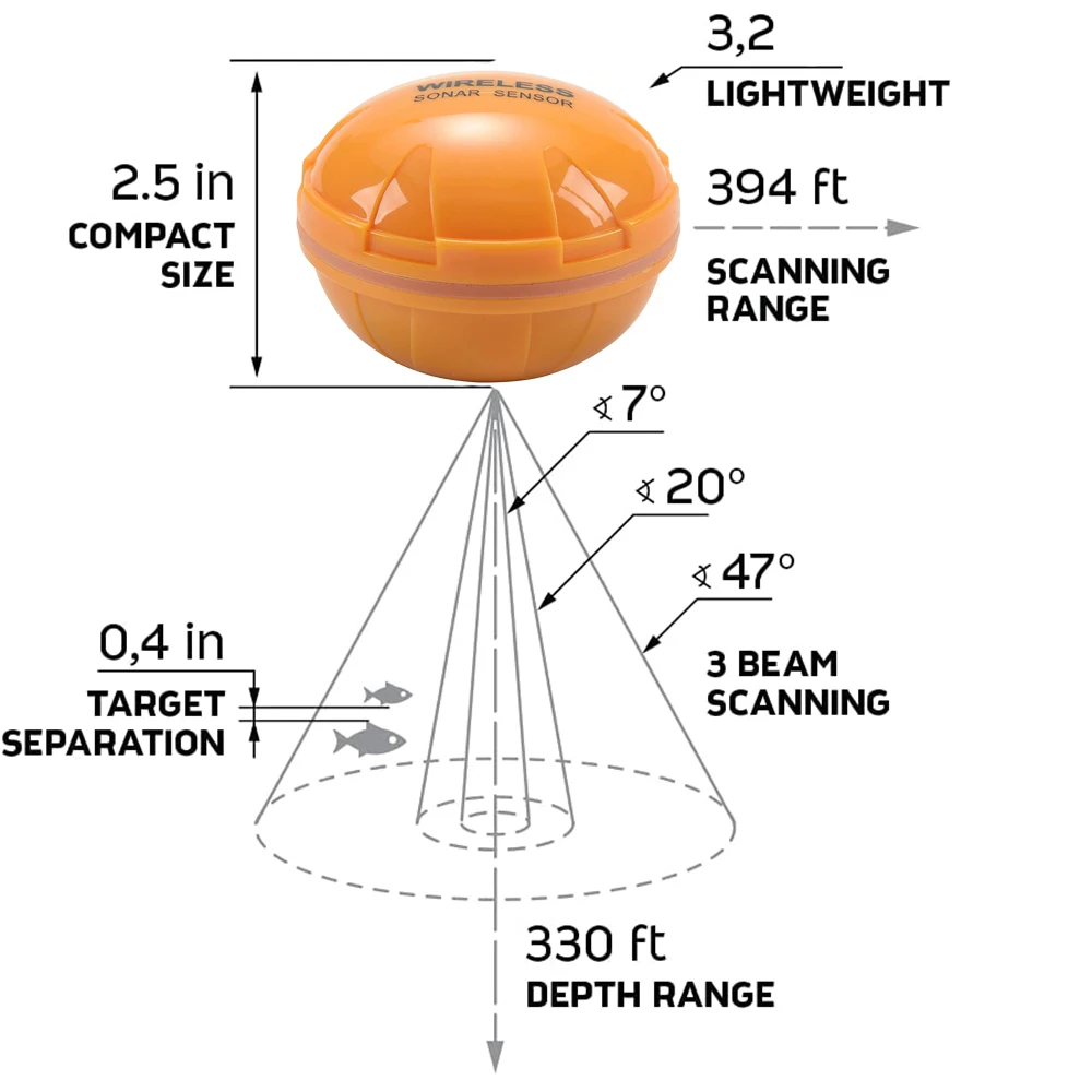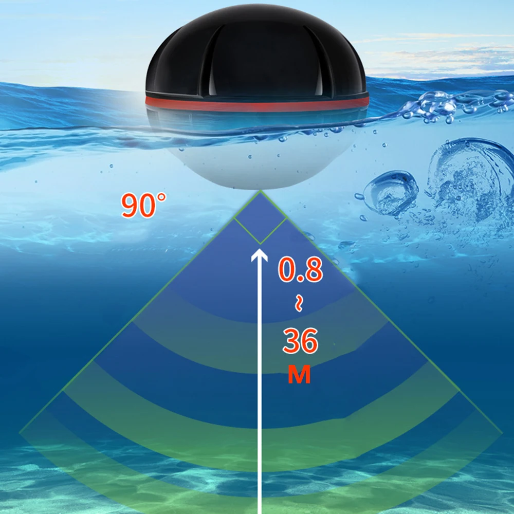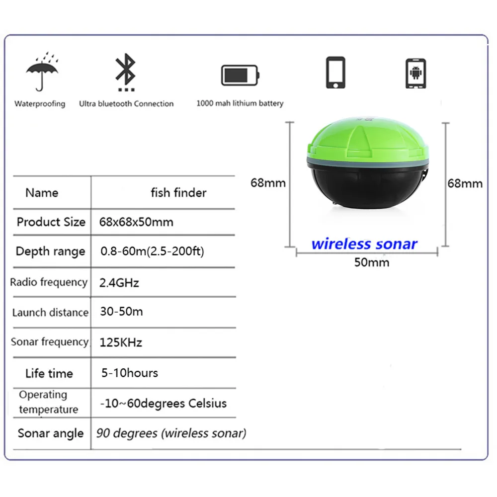for the user to select, sonar frequency is 125KHz, depth up to 200ft / 60m, with rechargeable 3.7V lithium-ion battery, the using time is up to 10-20 hours.