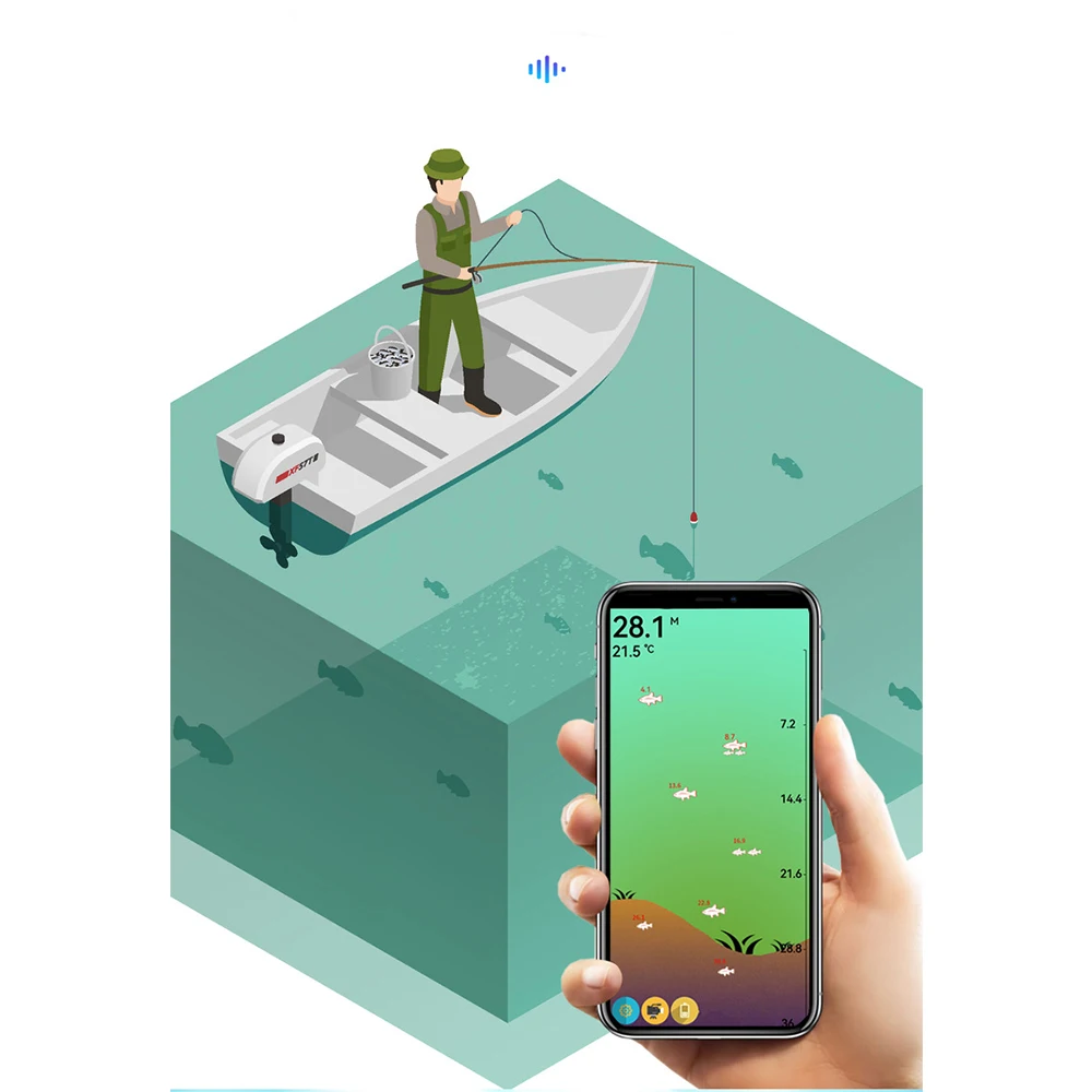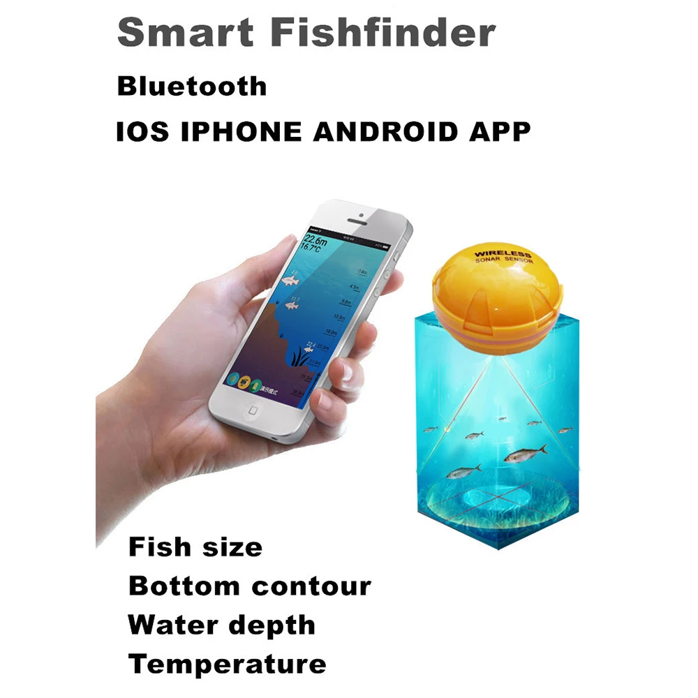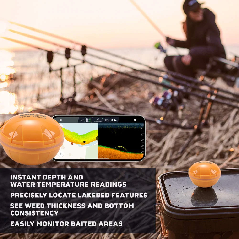 works in conjunction with smart phones and tablets, detection data is transmitted to the phone in real time, allows you to map water beds, mark spots, log water temps and depth, add lures, species and video in the trip log.