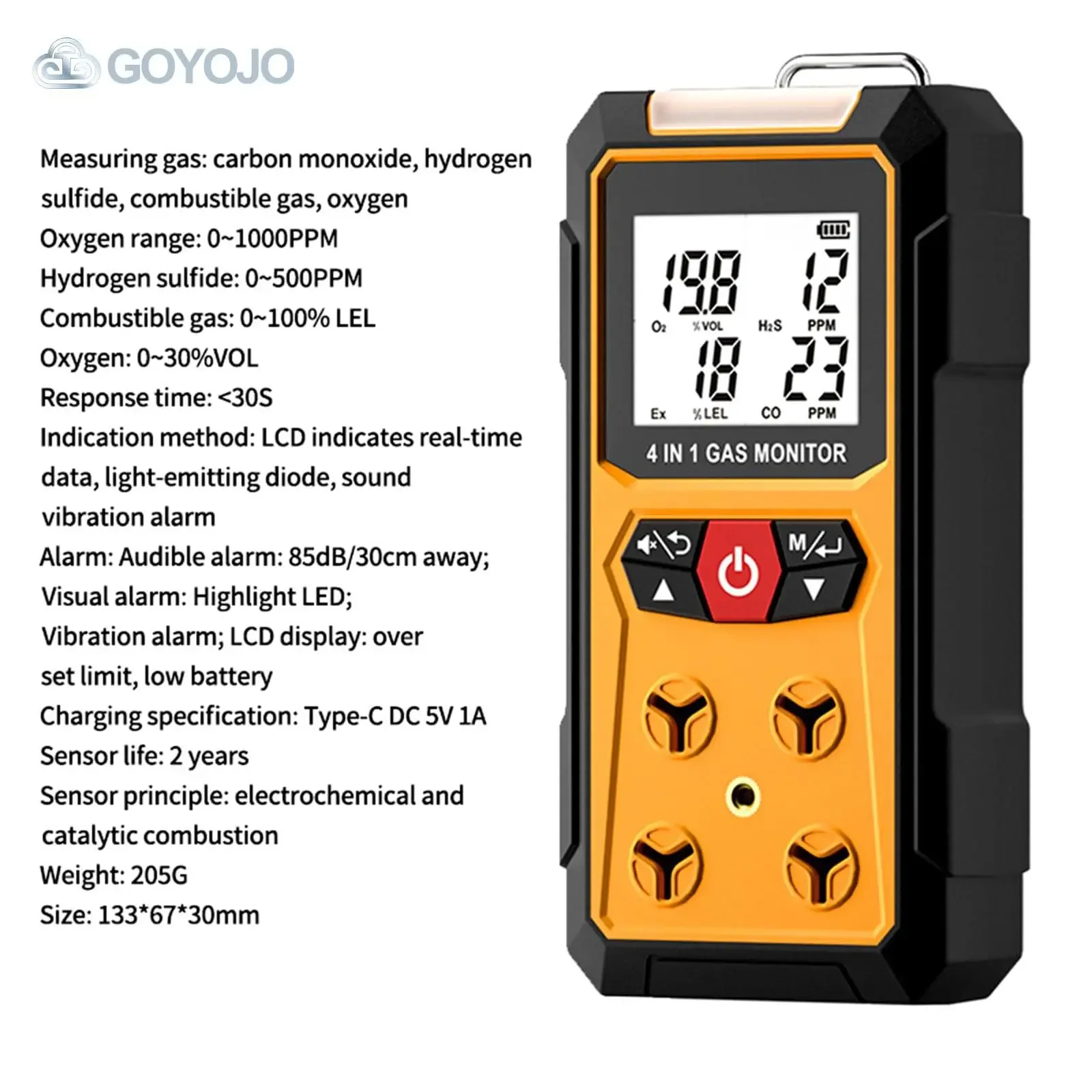 ENSURE SAFETY, PROTECT LIVES: Elevate security with the GOYOJO Gas Leak Detector, a comprehensive 4-in-1 monitor for H2S, EX, O2, and CO gases.
