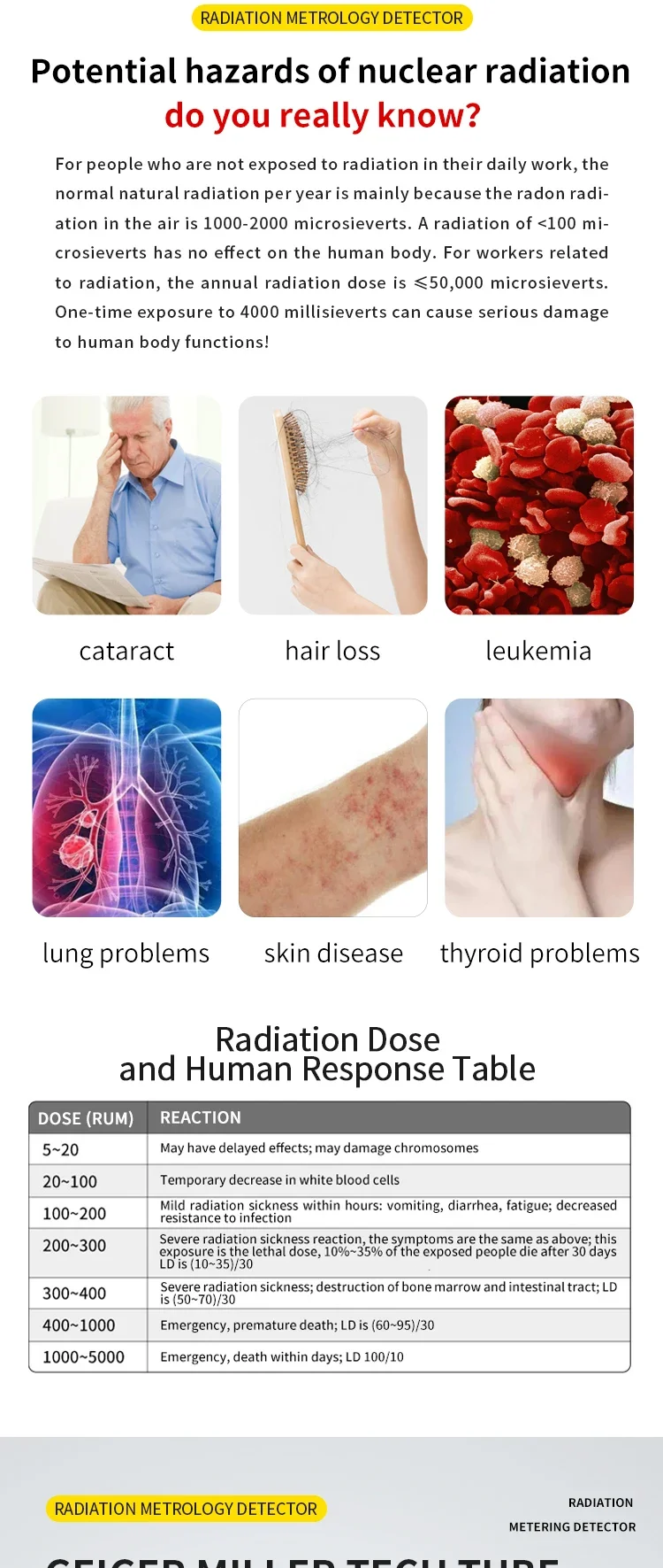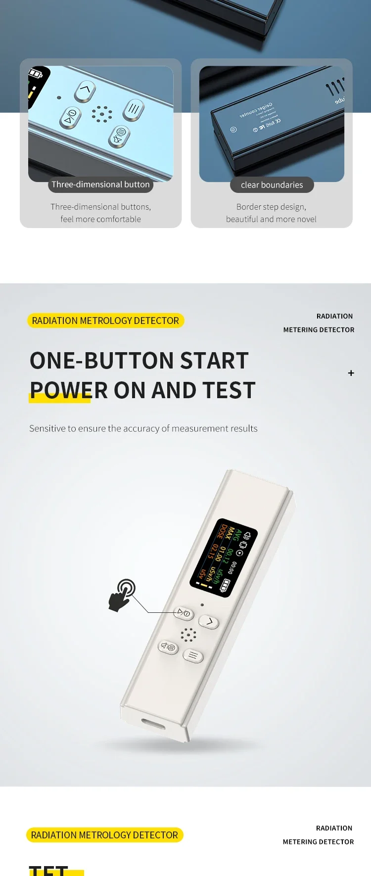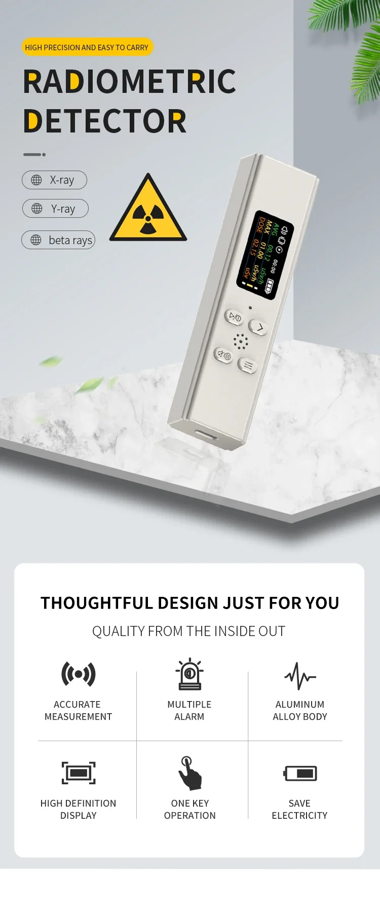 SMART ALARM–Radiation detector can be set to any cumulative alarm value and dose rate alarm value. When the radiation value exceeds the set value, the radiation dosimeter will automatically emit a loud sound and a flashing screen for alarm, avoiding the risk of radiation in daily life. The main technical specifications of the personal radiation detector are in accordance with international standards.