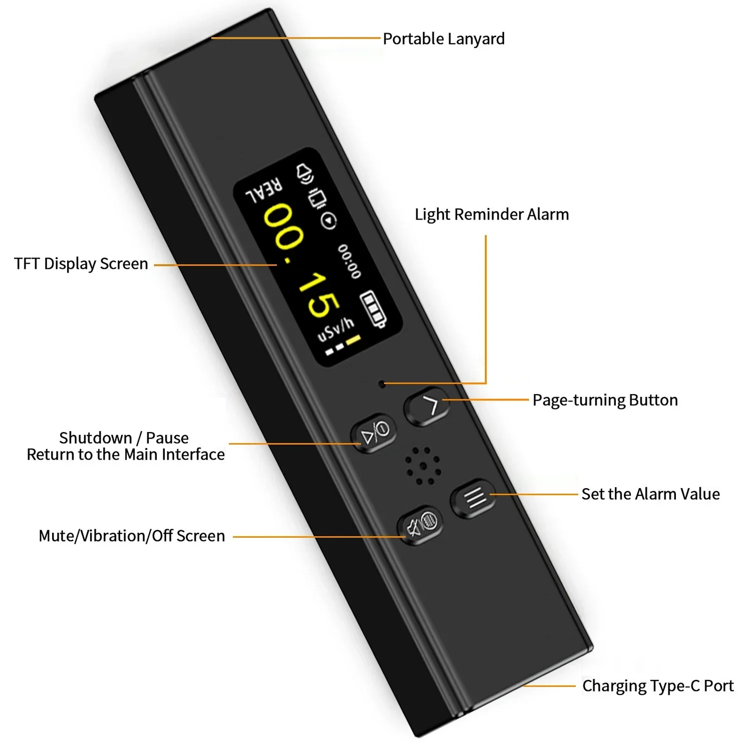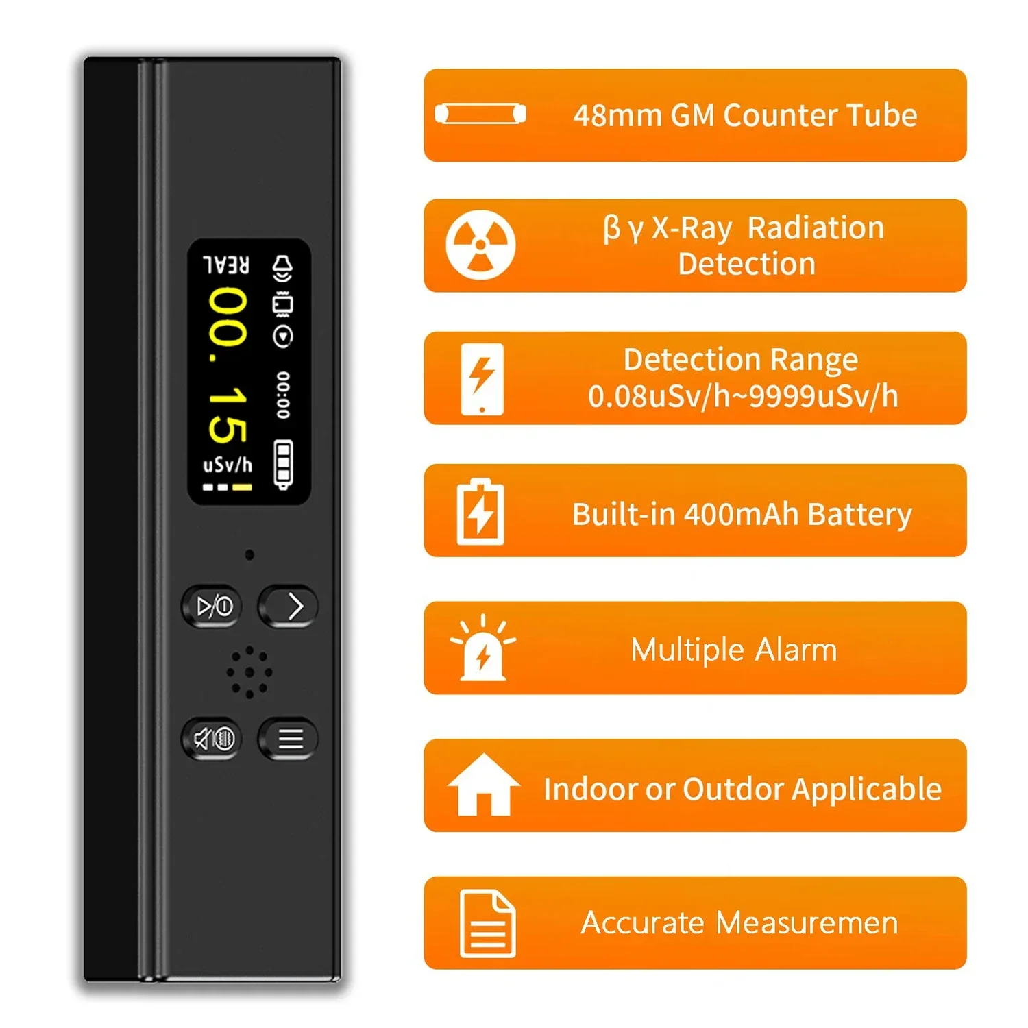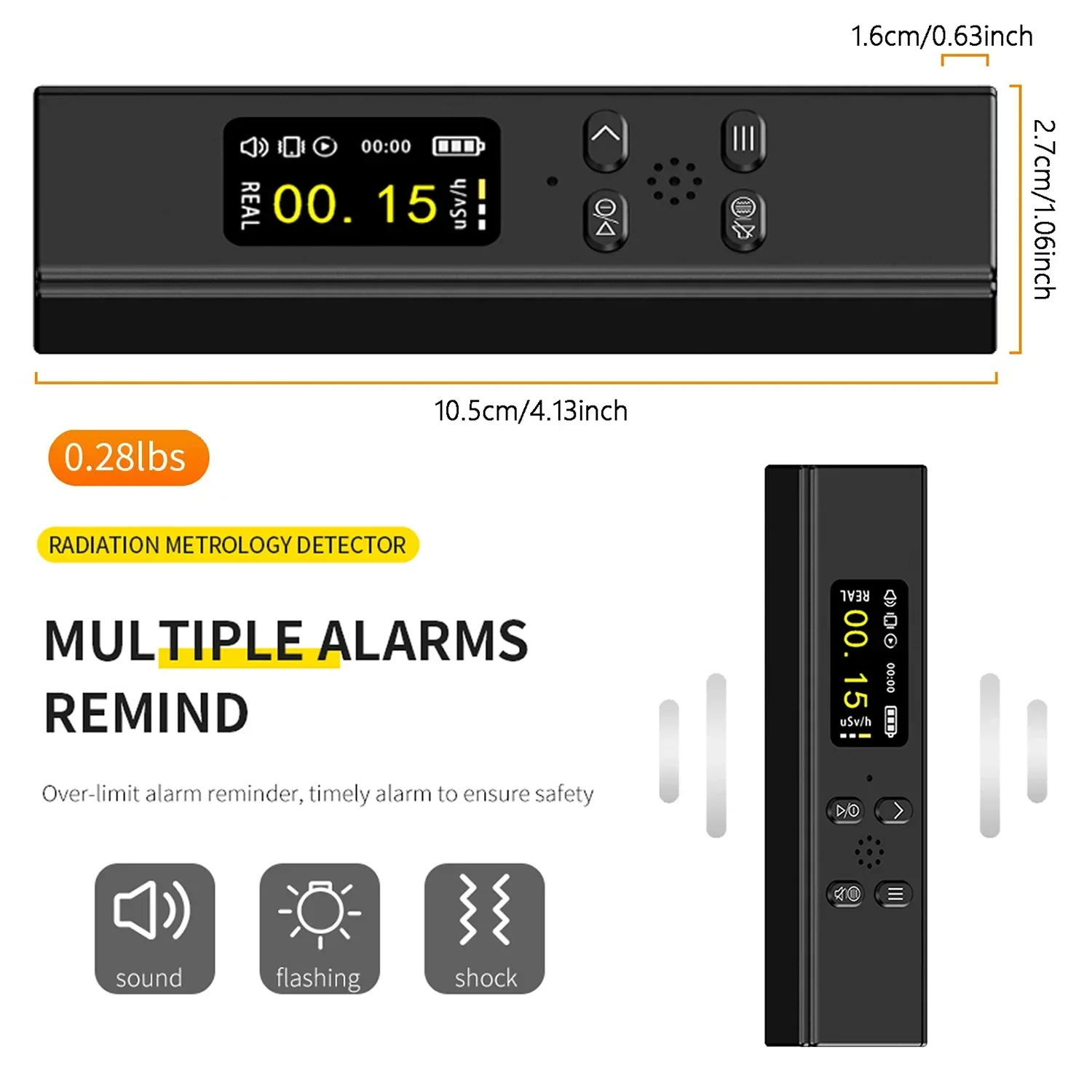 SMART ALARM–Radiation detector can be set to any cumulative alarm value and dose rate alarm value. When the radiation value exceeds the set value, the radiation dosimeter will automatically emit a loud sound and a flashing screen for alarm, avoiding the risk of radiation in daily life. The main technical specifications of the personal radiation detector are in accordance with international standards.