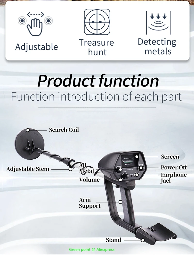 ◆ Waterproof Search Coil – Lets you search for metal objects under
