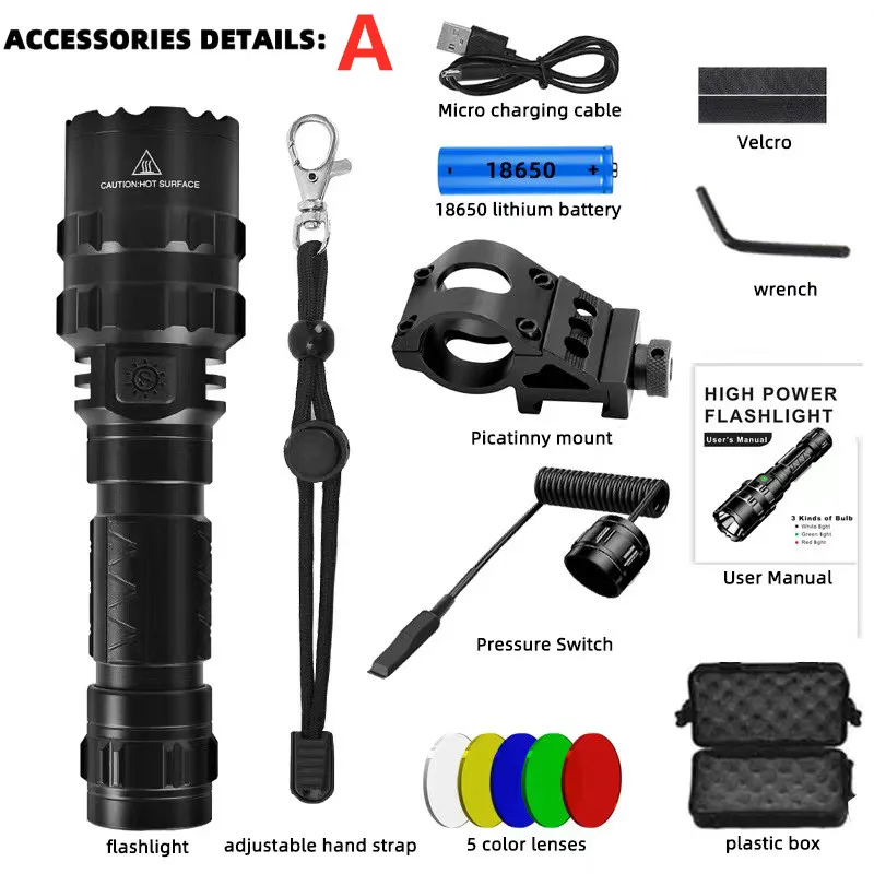 380g (flashlight, rope, charging cable, 18650 battery, Picatini stand, pressure switch, 5 colors of lenses, Velcro, wrench, user manual, plastic packaging box)